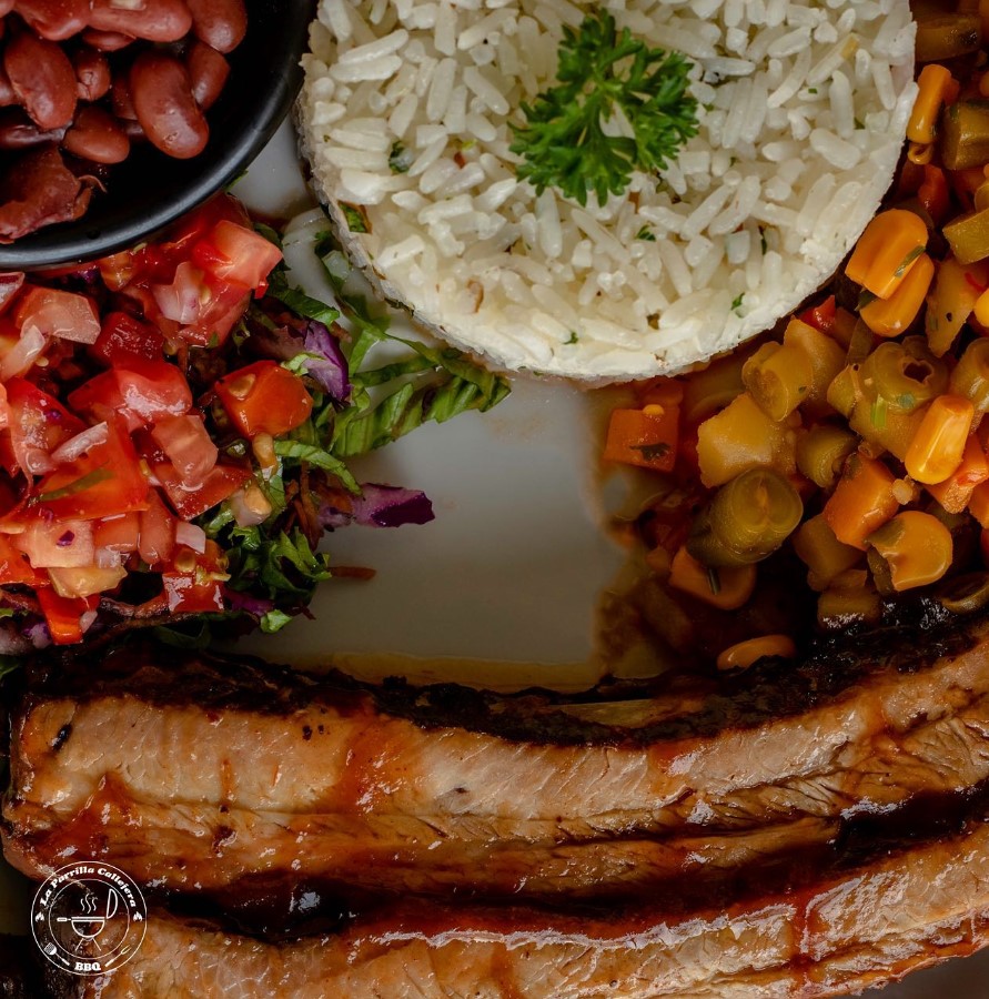 200 gramos de res, 200 de pechuga de pollo, 200 de costilla de cerdo ahumada,200 de chorizo ahumado, acomapañada de 2 guarniciones a elegir.