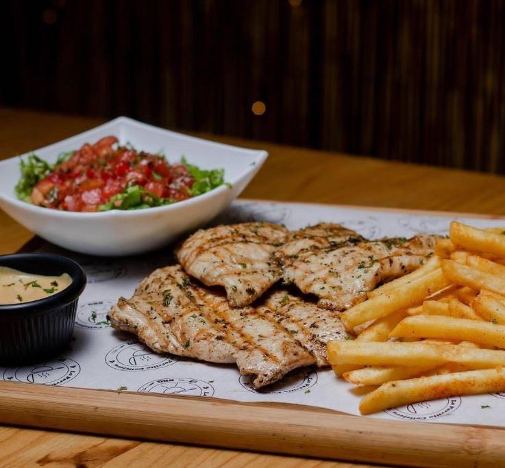 300 gramos de jugosa pechuga de pollo a la parrilla, acompañada de 2 guarniciones a elegir.