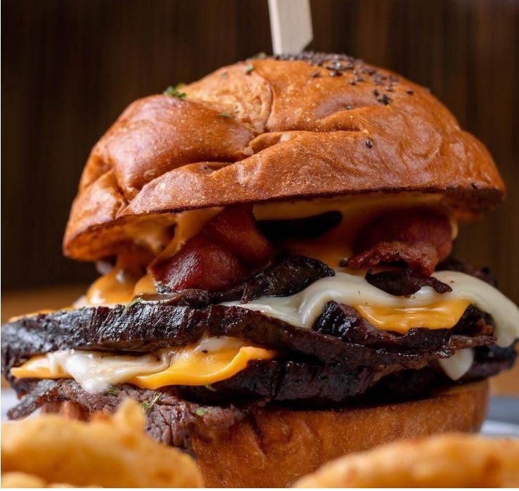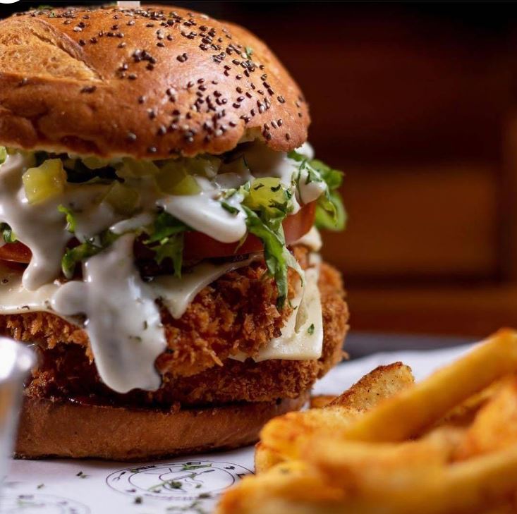 Pan de papa, doble filet de pechuga de pollo empanizada al panko, doble queso mozarella, tocino ahumado, pepinillos dulces, cebolla caramelizada en vinagre balsamico, tomate fresco, lechuga y salsa a elegir.