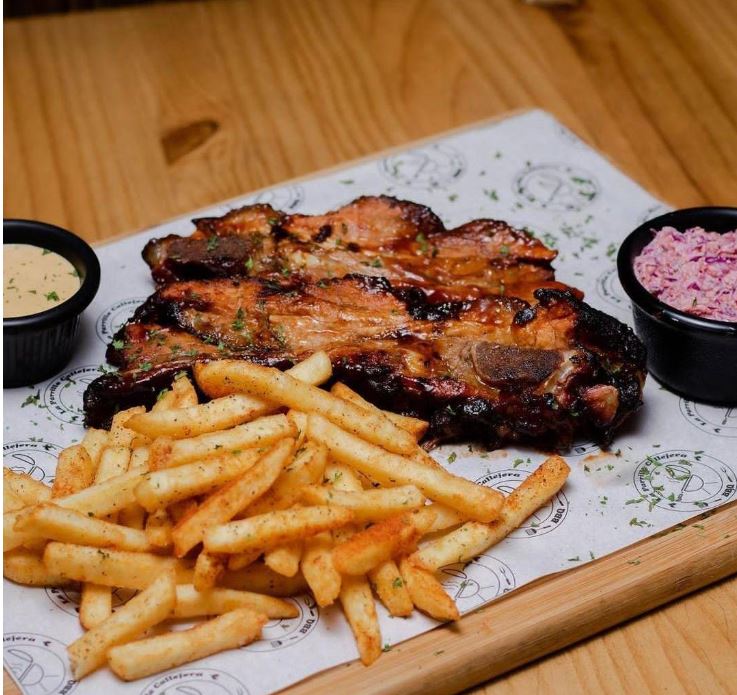 350 g. de costilla tierna ahumada bañada en salsa BBQ y dos acompañamientos a elegir.