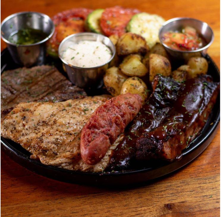 300 gramos de res, 300 de pechuga de pollo, 300 de costilla de cerdo ahumada,300 de chorizo ahumado, acomapañada de 2 guarniciones a elegir.
