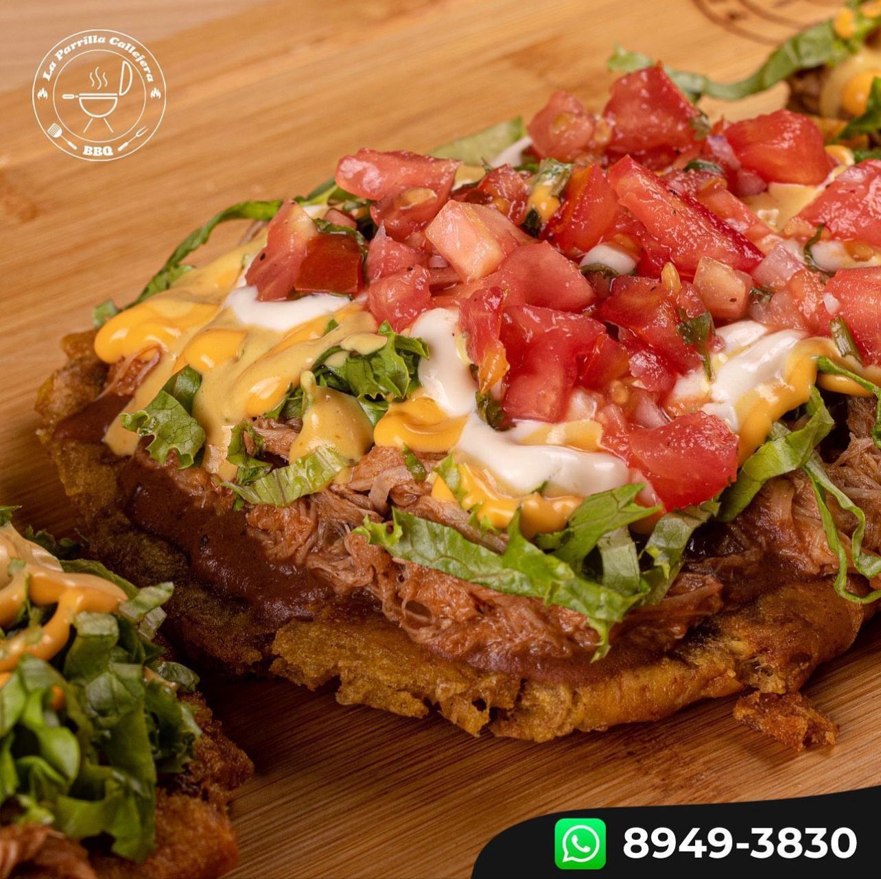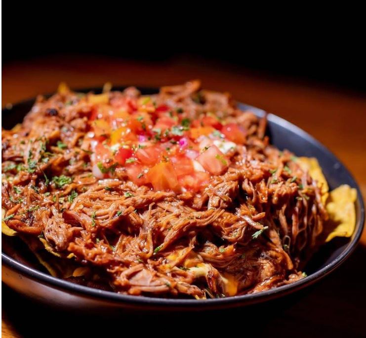 Cama de chips de nacho, pulled pork ahumado en madera de nance con salsa bbq, frijoles molidos, salsa de queso, salsa de la casa, natilla y pico de gallo.