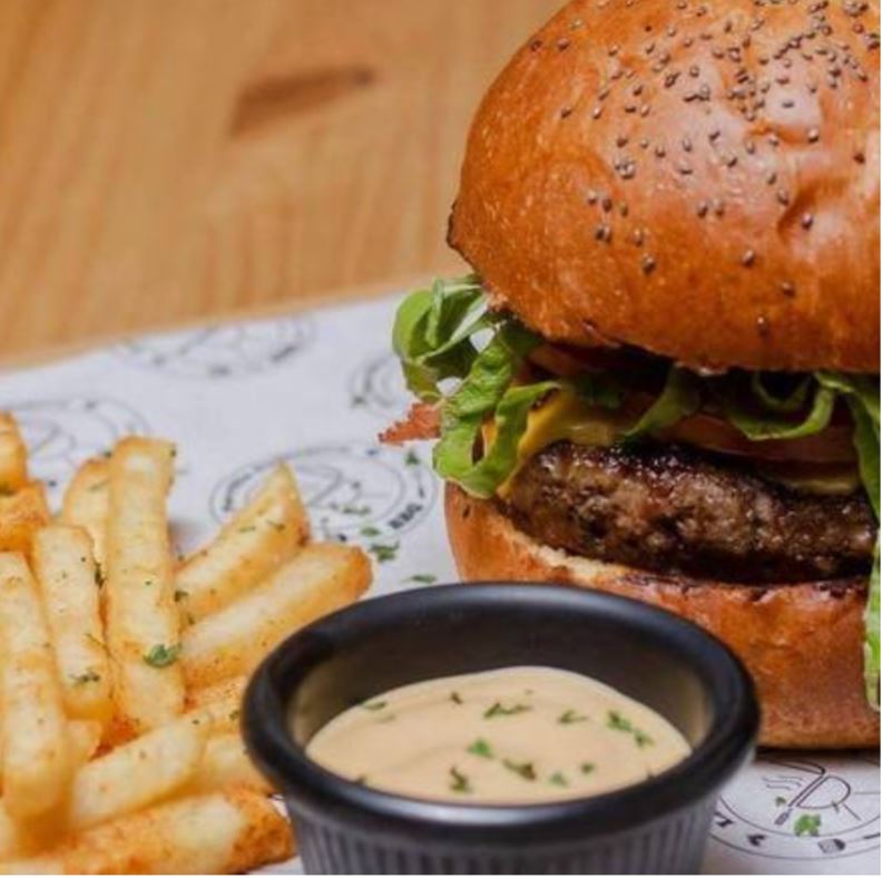 Pan de papa, 150 gramos de carne calidad angus 80/20, queso americano, tomate, lechuga, salsa BBQ y salsa de la casa.( incluye papas fritas, yuca frita o aros de cebolla).