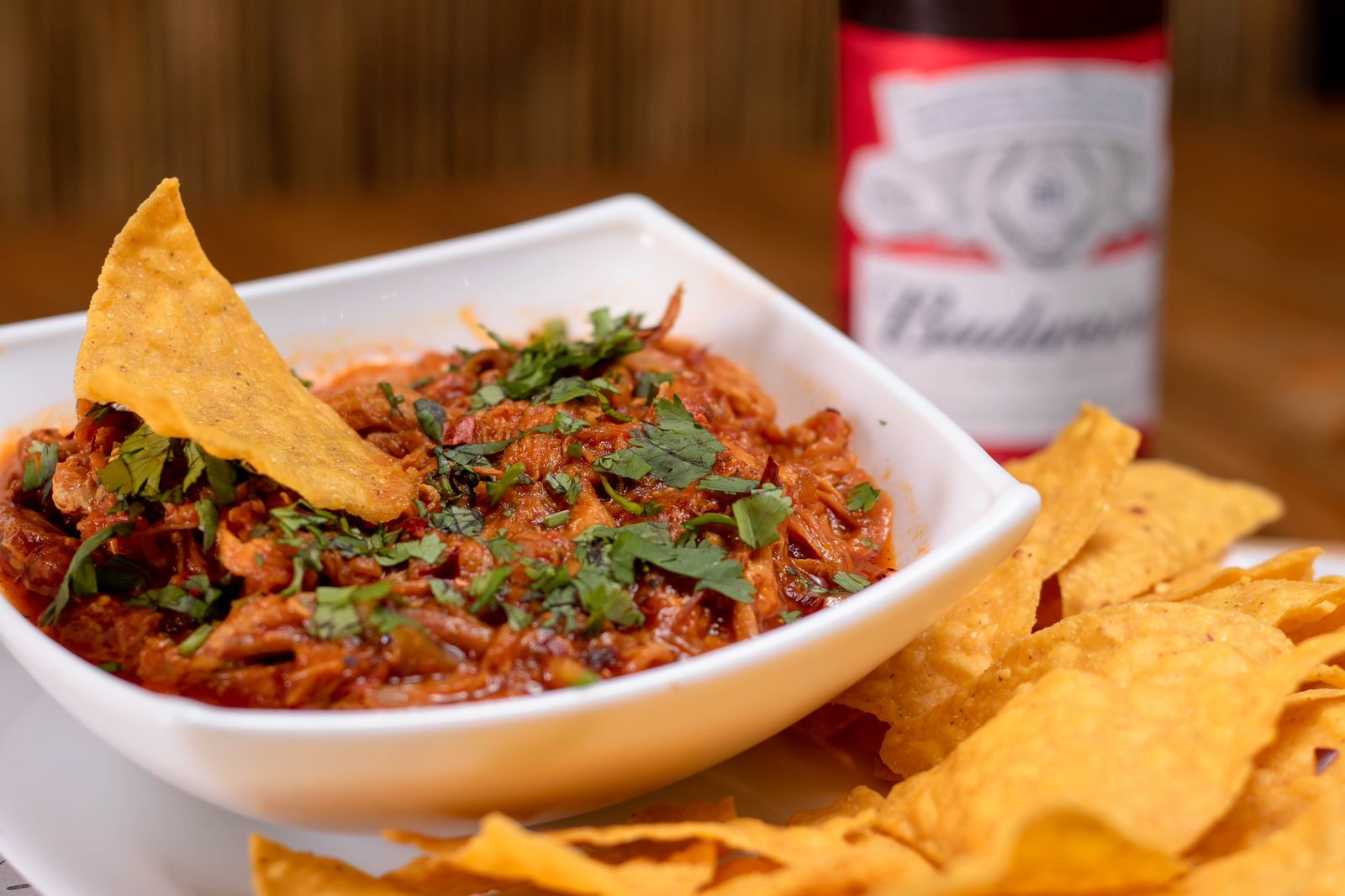 Pulled pork ahumado en salsa bufalo acompañado de chips de nacho