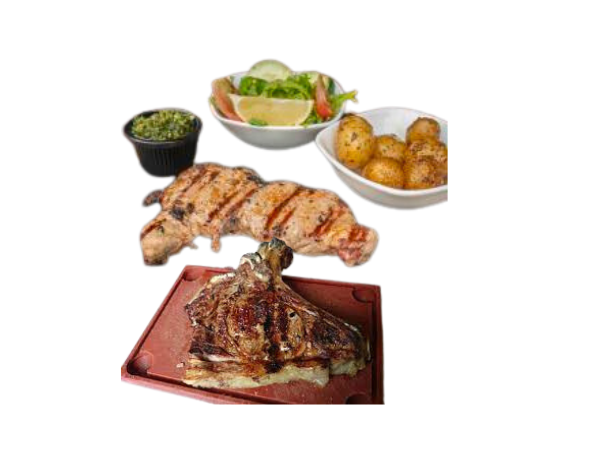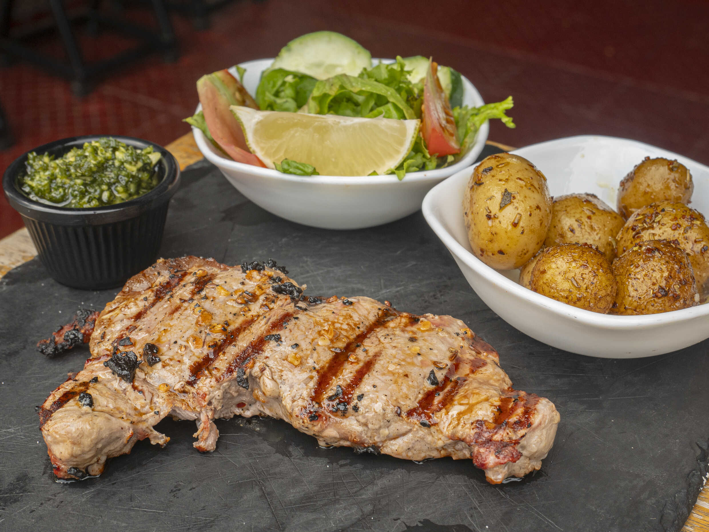 Chuletón de 300 g servido con chimichurri argentino y 2 acompañamientos a elegir.