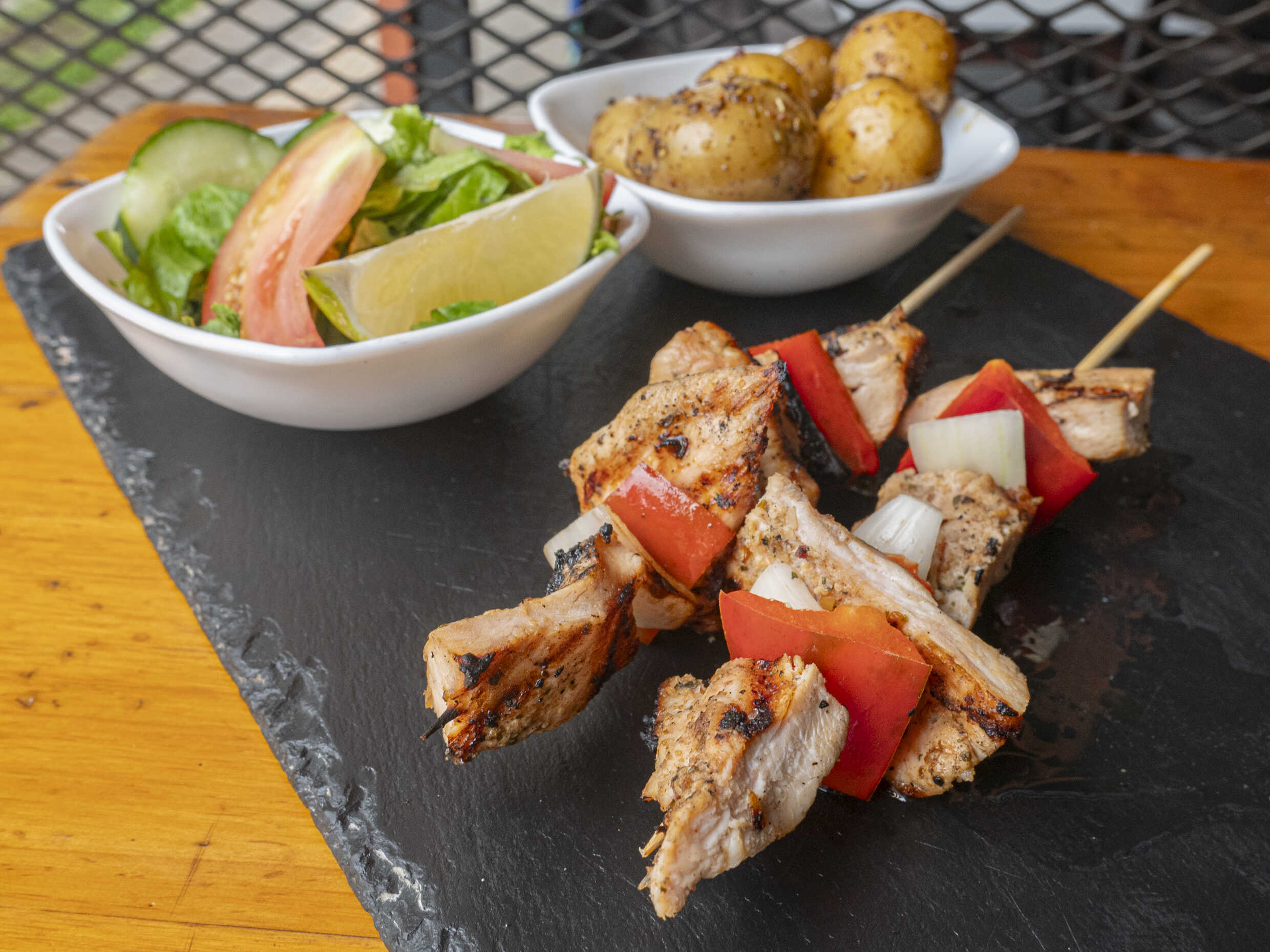 Productos personales; 2 pinchos con suaves y jugosos trozos de carne o pollo a la parrilla y 2 acompañamientos a elegir.