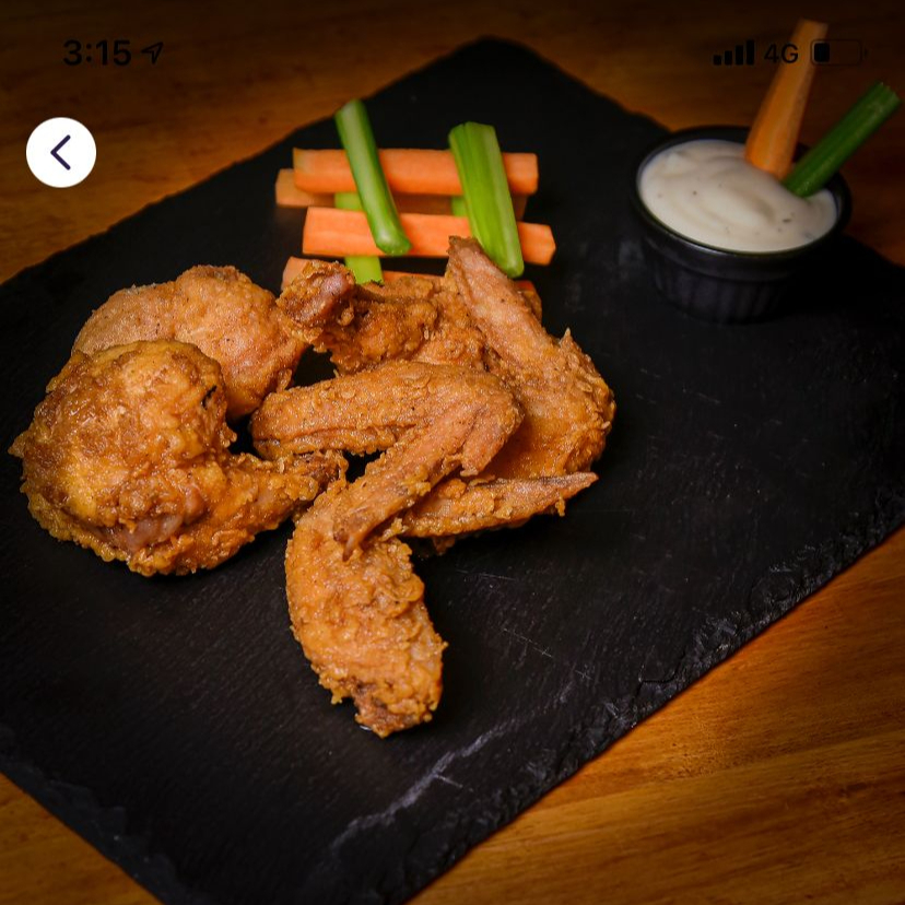 6 Alitas con bastones de zanahoria, apio y salsa ranch. Platillo personal.