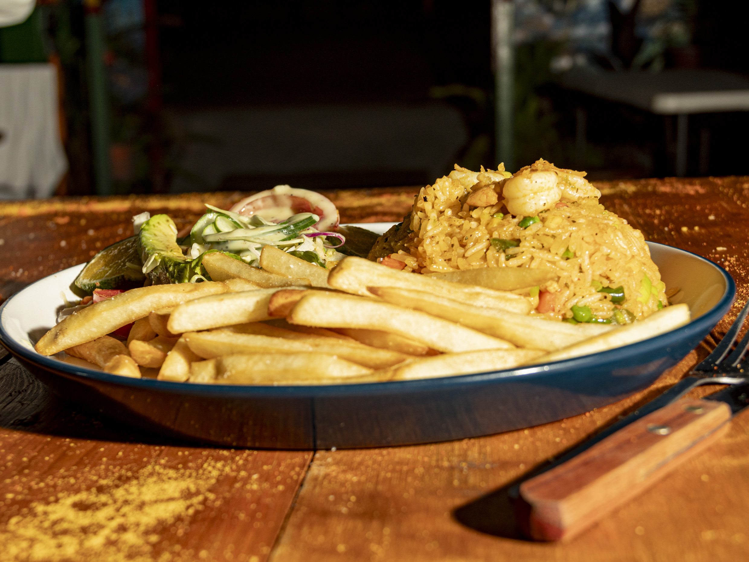 Arroz con camarones acompañado de papas fritas y ensalada de lechuga con tomate.