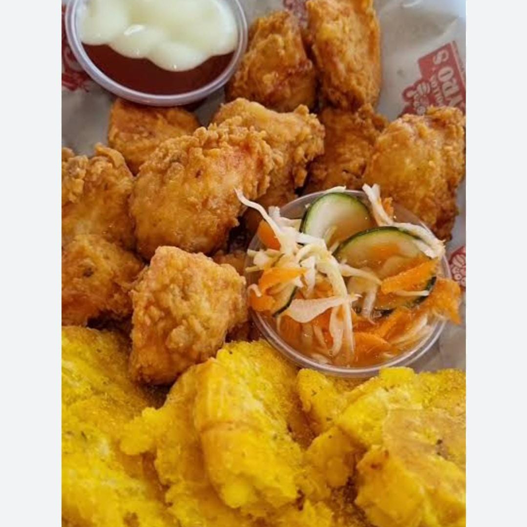 Bolitas de pollo al estilo caribeño empanizados acompañado de patacones 4 y sus salsas de lacasa y su chile picante