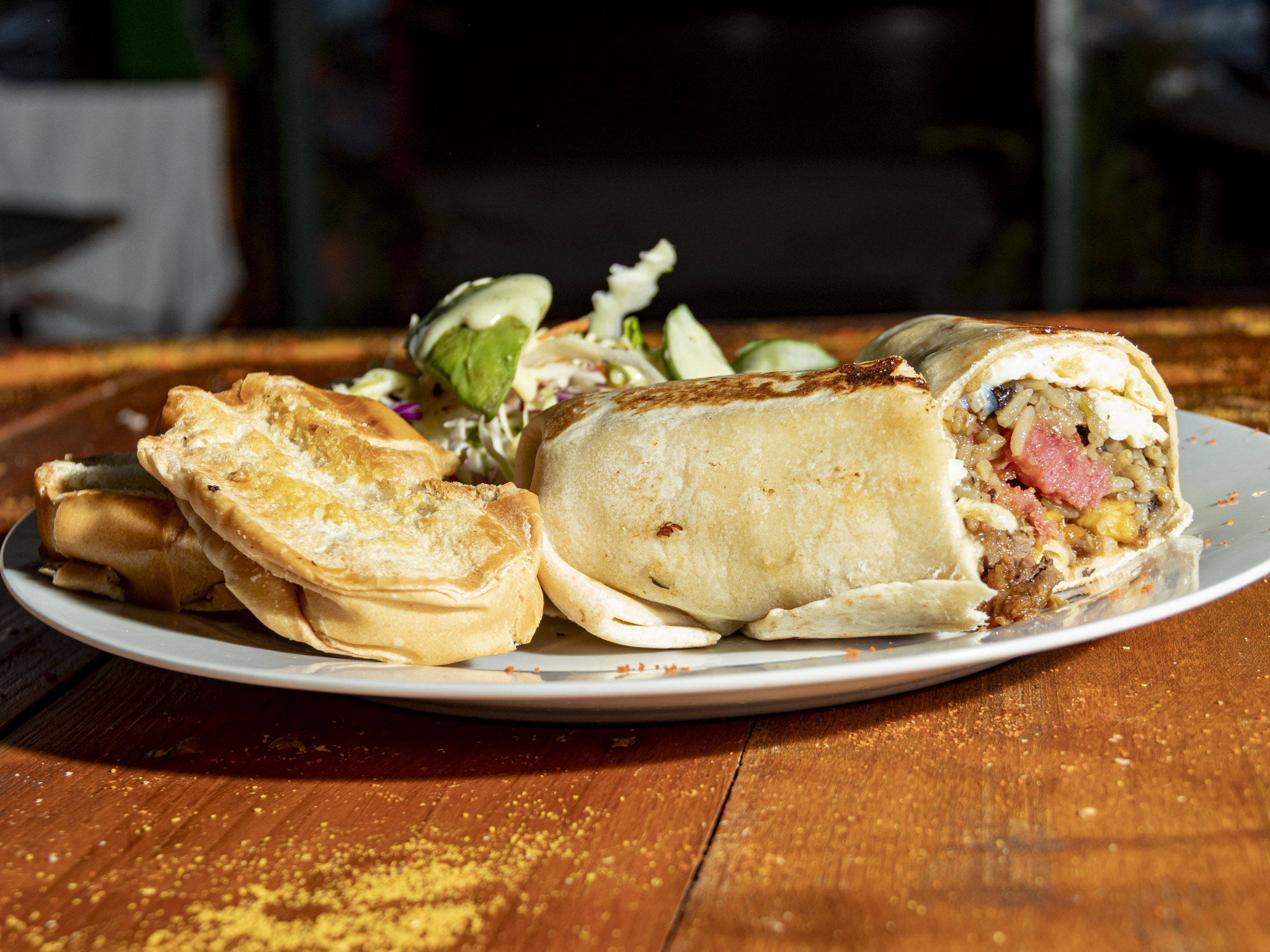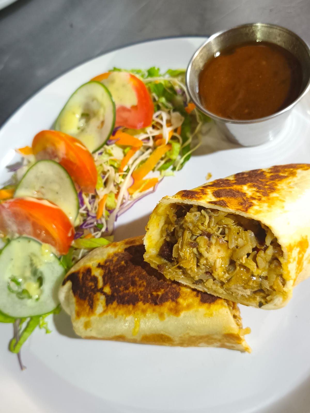 Tortilla de harina de trigo, rice and beans, pollo caribeño, ensalada y deliciosa salsa caribeña