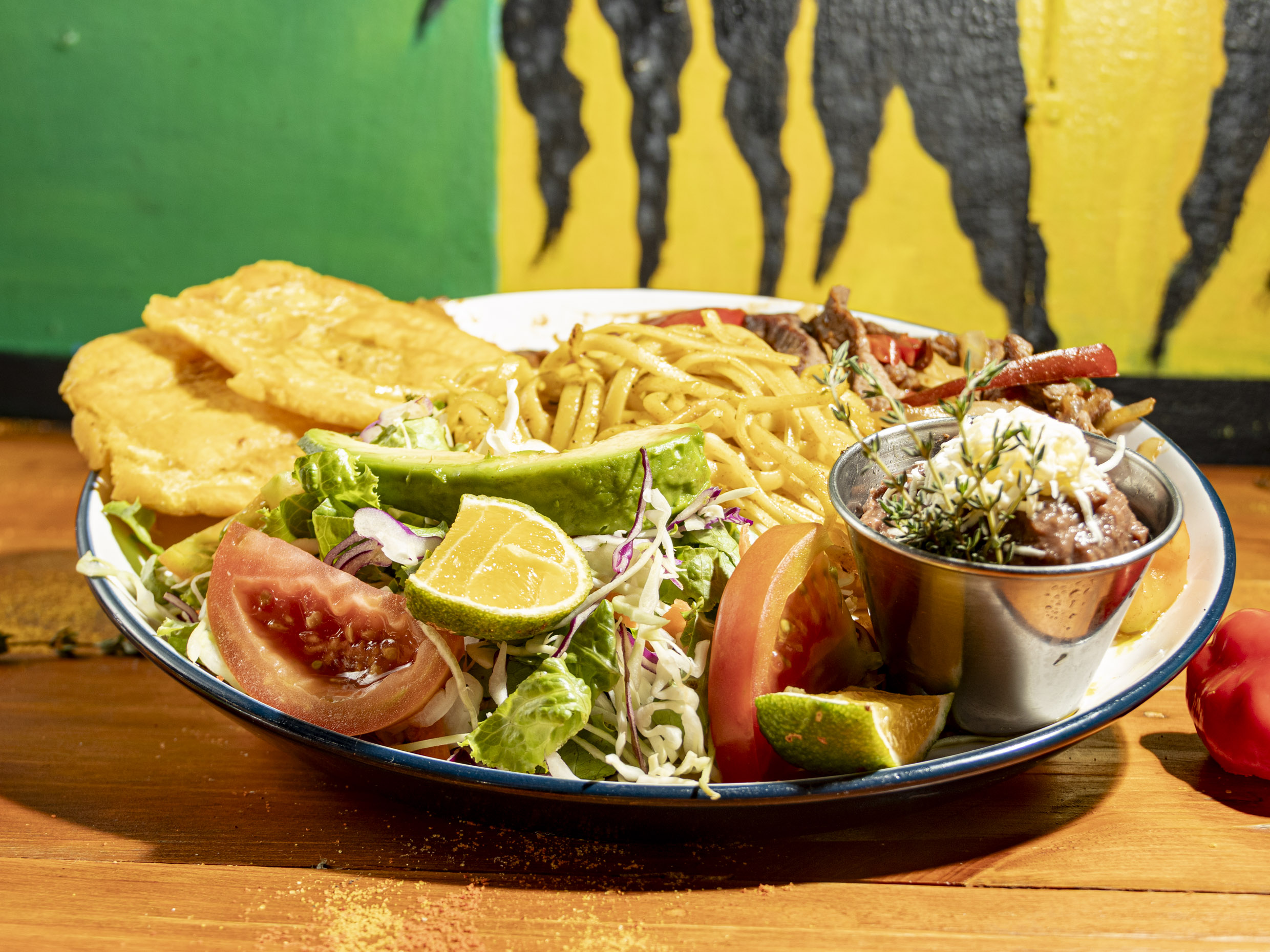 Arroz, frijoles, ensalada verde, plátano maduro y espagueti al curry. Proteína a elegir entre: bistec, chuleta, pescado empanizado, fajitas de pollo, fajitas de carne o carne mexicana. Incluye té frío de la casa.