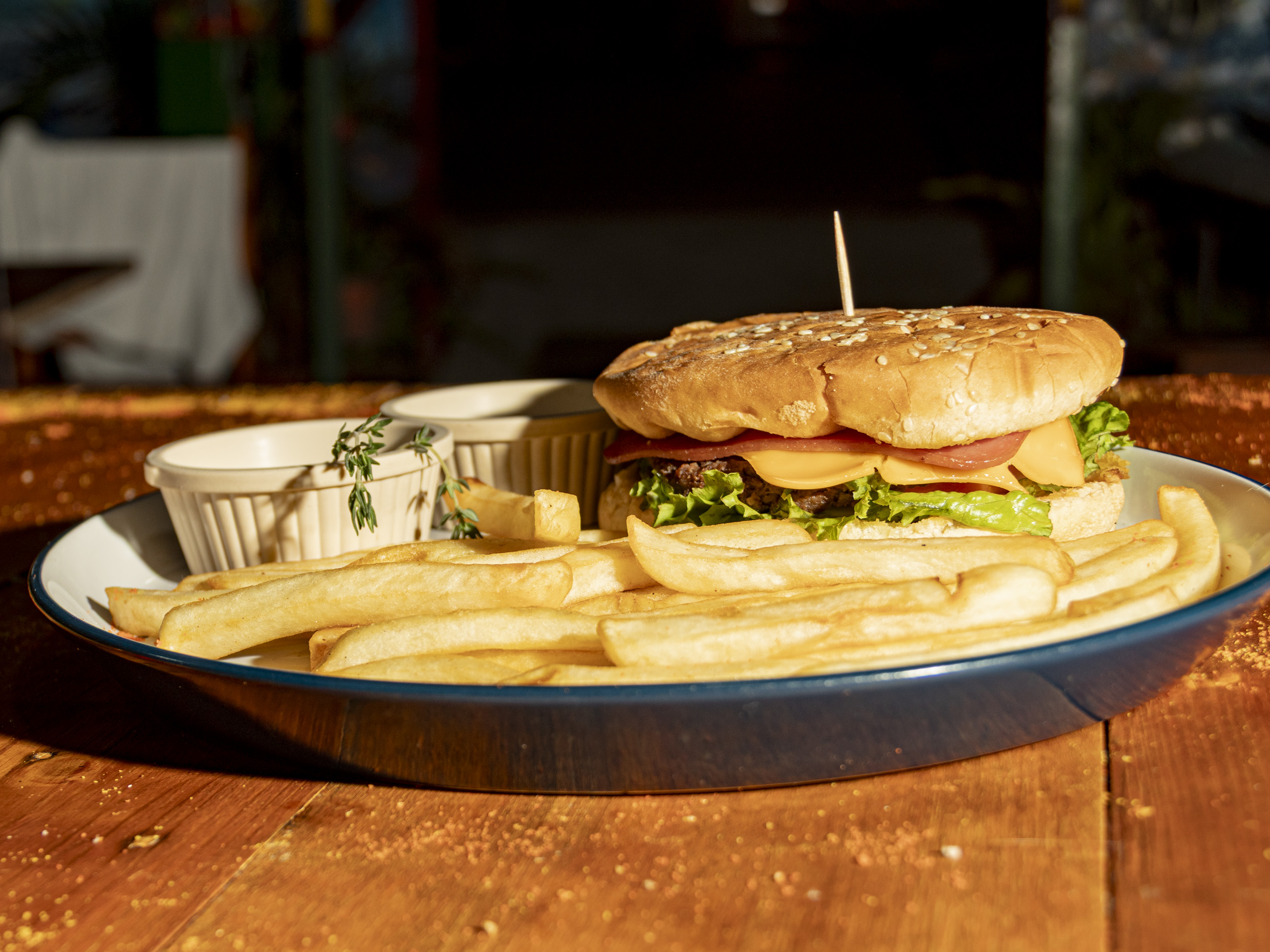 Deliciosa hamburguesa de carne acompañada de cebolla, tomate, pepinillo, lechuga y deliciosas papas fritas.