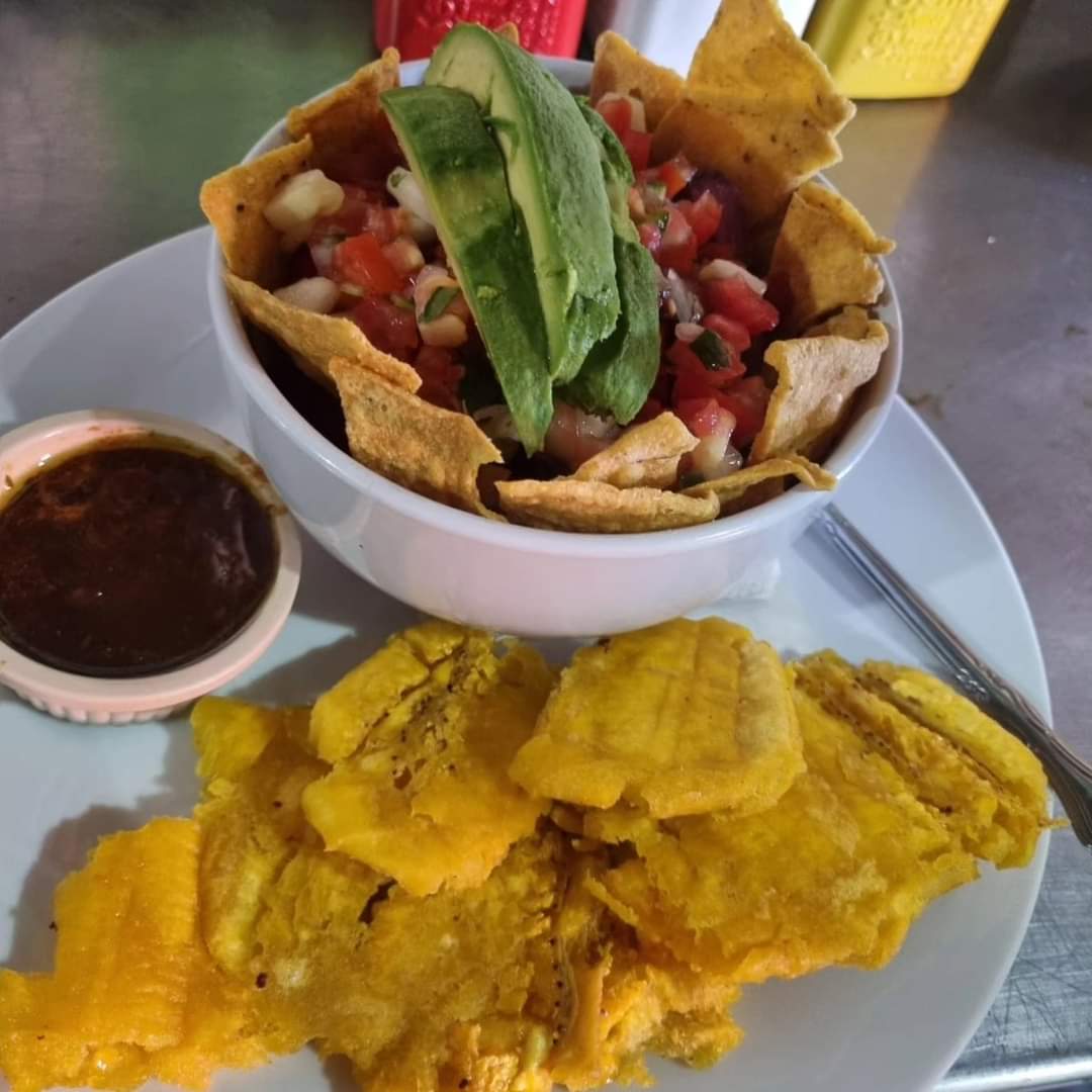 Delicioso rice and beans con chicharrón, patacones, picó de gallo con aguacate fresco, patacones, tortillas y caldo caribeño.