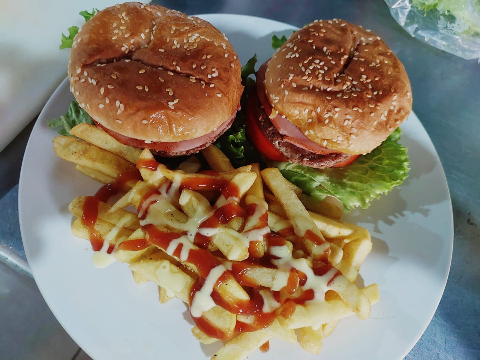 Dos deliciosas hamburguesas de carne con cebolla, lechuga, tomate, pepinillos y deliciosas papas fritas.