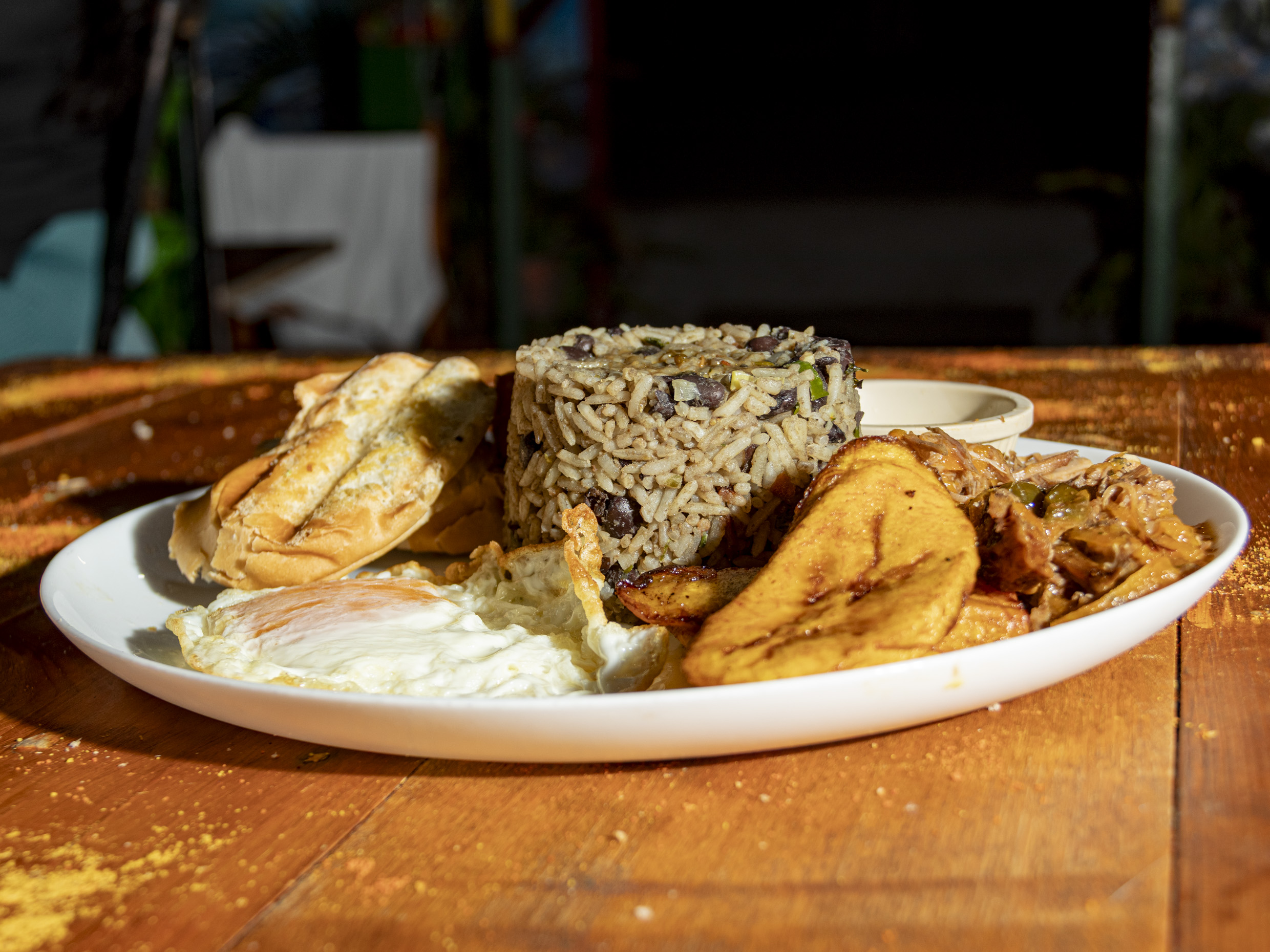 Rice and beans acompañado de ensalada, plátano maduro y proteína a elegir.