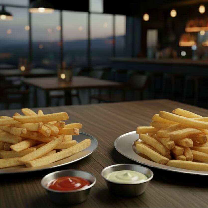 Porción de papas en gajos fritas. Con harina, sal pimienta y paprika.