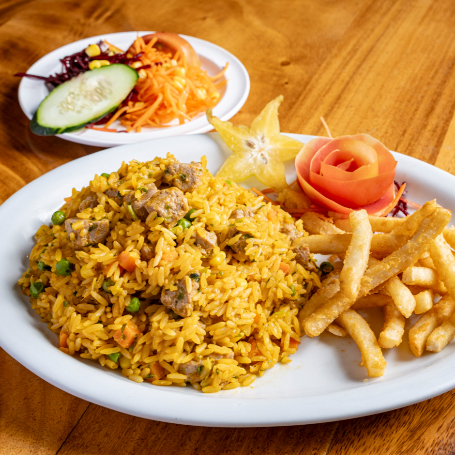 De la casa: Con pollo, res y camarón. Acompañado de dos guarniciones a elegir entre arroz, puré, ensalada de zanahoria y remolacha o papas fritas.