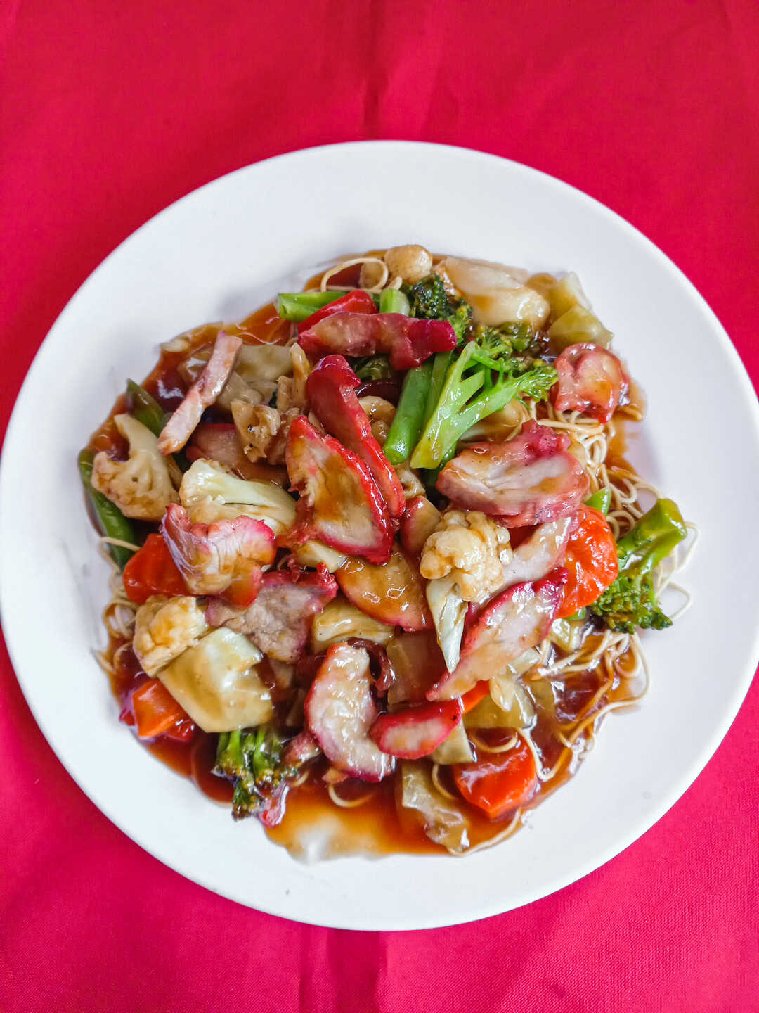 Chop suey en salsa de ostión con cebolla, zanahoria, especias, pollo, jamón, lechón y tallarines (120 g de proteína). Máximo para 2 personas.