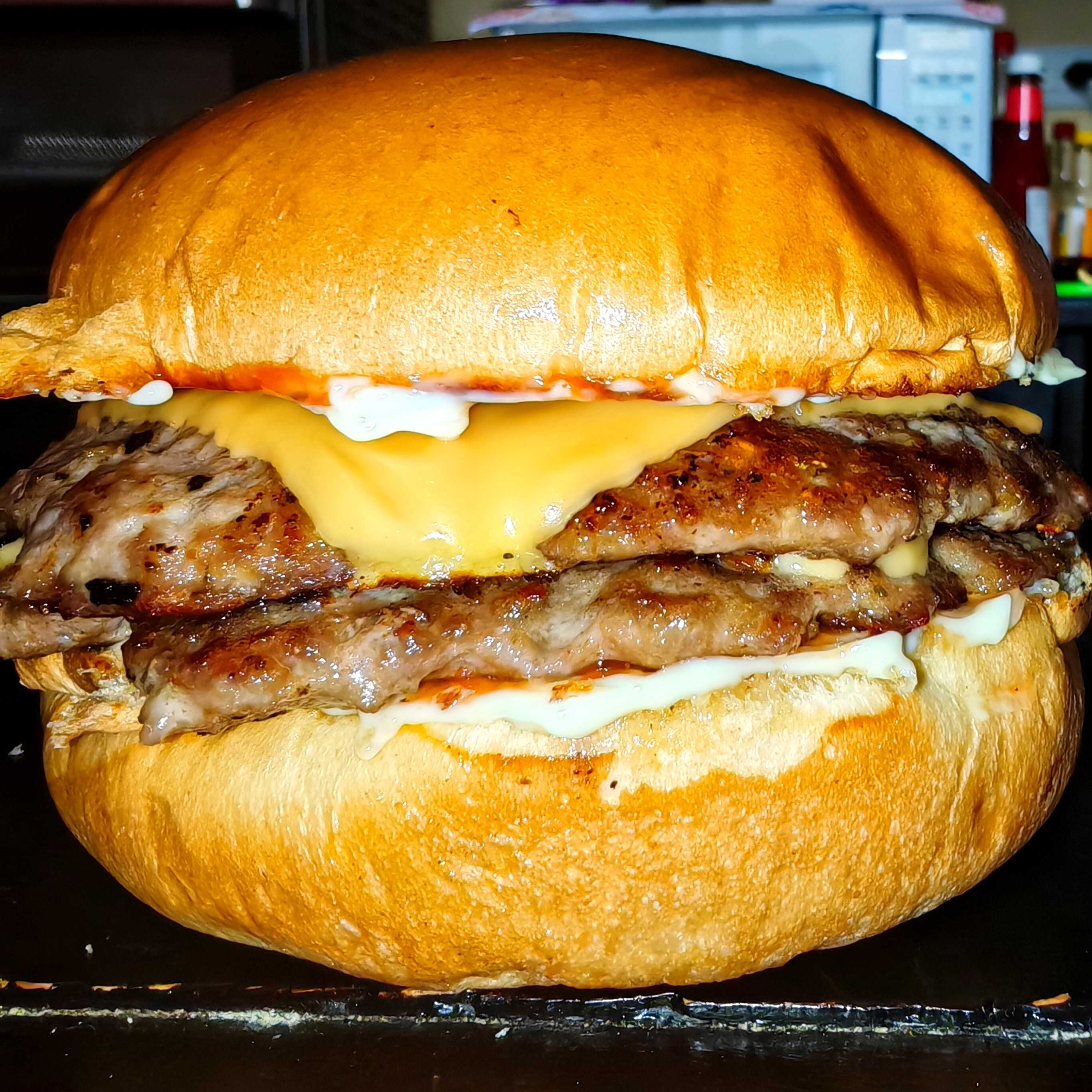 2 Tortas, 2 quesos amarillos, salsas, salsas, (mayonesa de la casa y salsa de tomate).