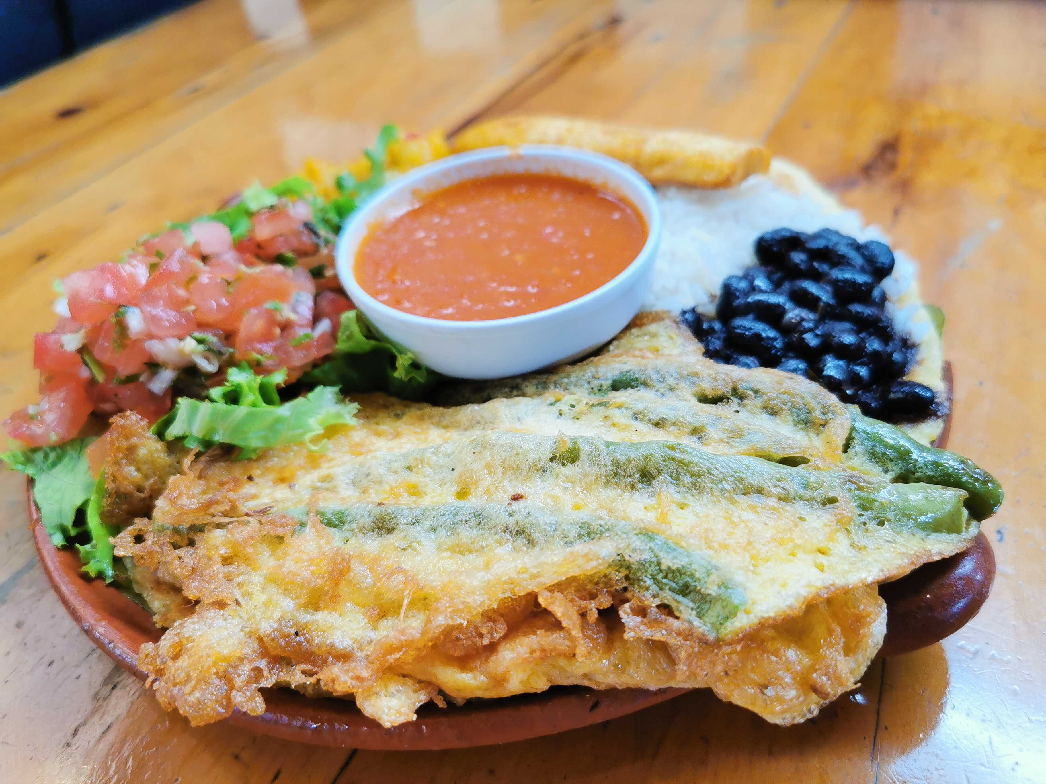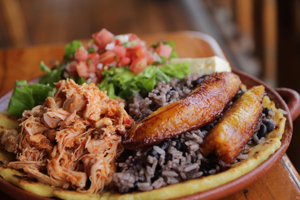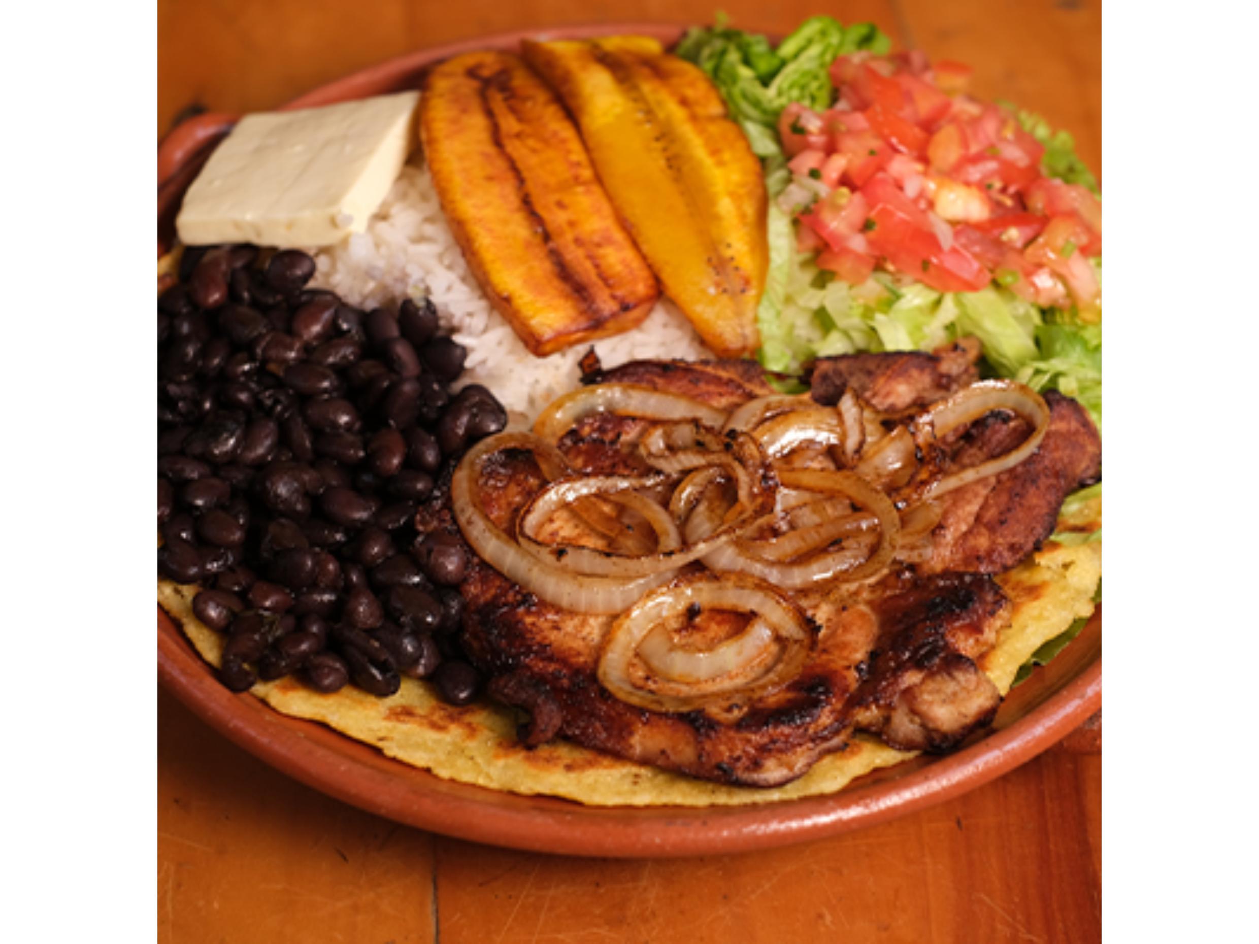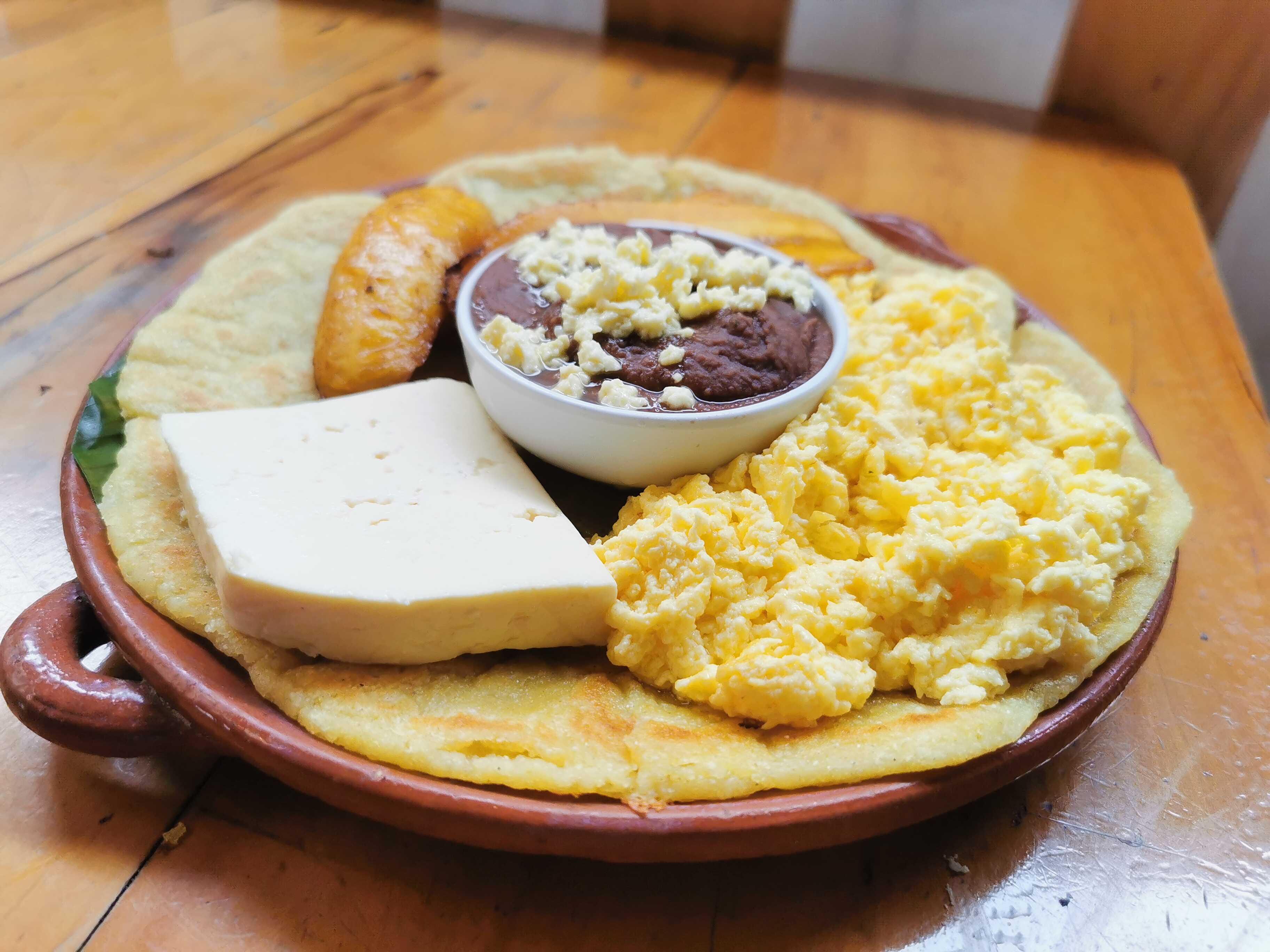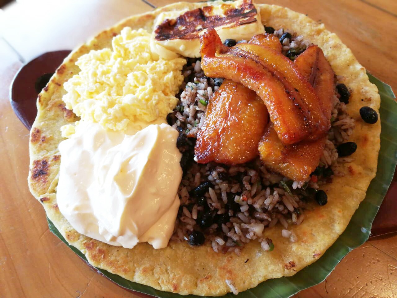 Tortilla de queso, arroz, frijoles o gallo pinto, ensalada de lechuga y tomate, plátanos maduros, queso natural.