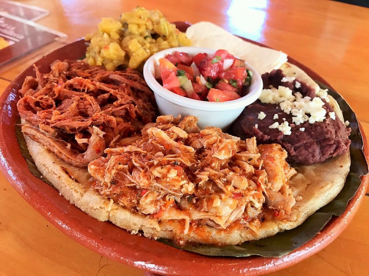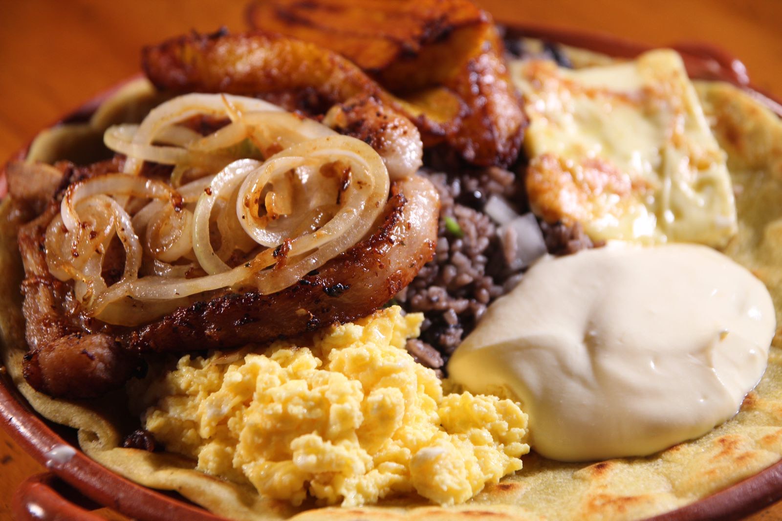 Tortilla de queso acompañada con gallo pinto, natilla, huevo picado, maduros y carne mechada