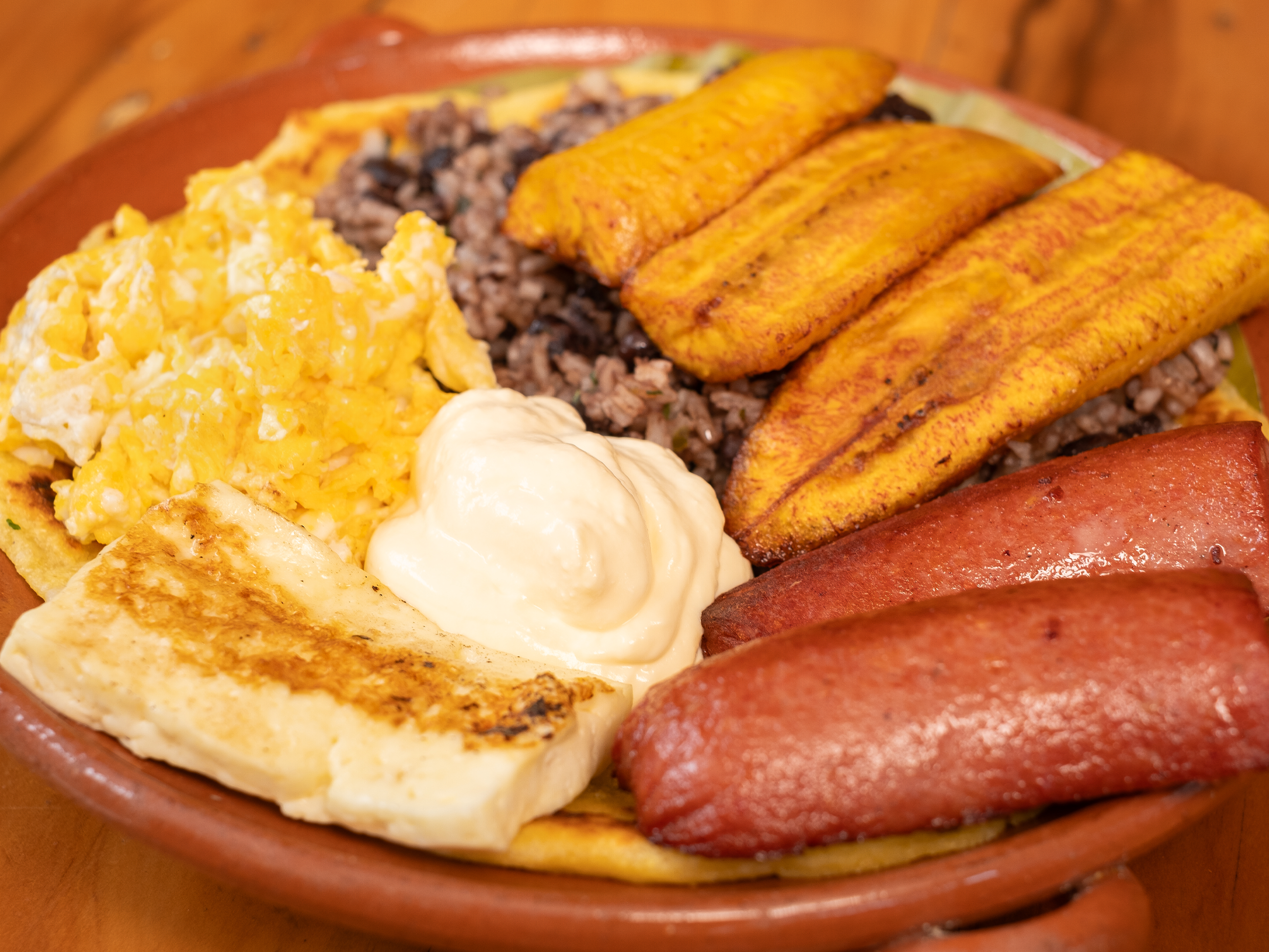 Pinto, huevo, plátano maduro, natilla y chuleta.
