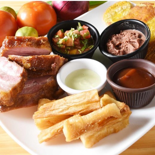250 g De deliciosa costilla de cerdo, servida con yuca frita y patacones, acompañados de frijoles molidos, mayonesa de la casa y pico de gallo.