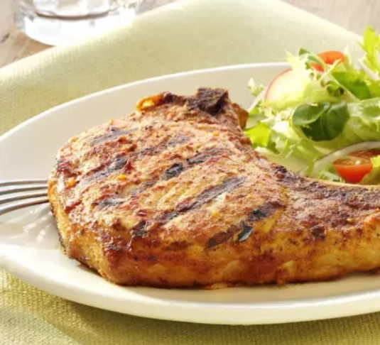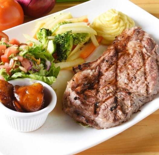 Jugosa chuleta de 350 g, exquisitamente adobada con especies naturales preparada a la plancha y 4 acompañamientos a elegir.