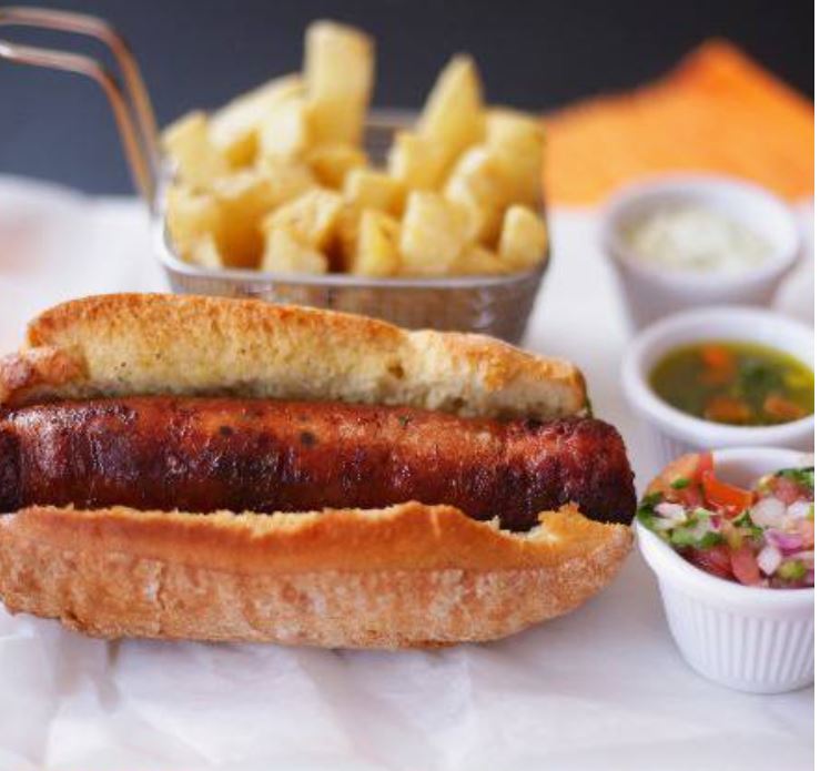 150 g De Chorizo, servido entre fresco pan artesanal bañado con exclusivo aderezo de la casa, acompañado con papas fritas, chimichurri y pico de gallo.