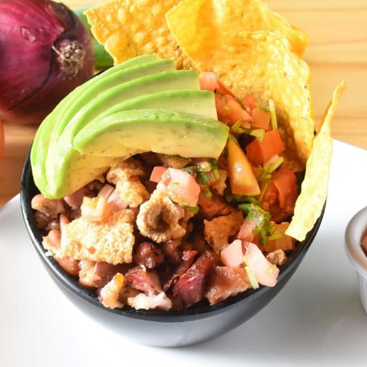 250 g De chicharrón de carne, 50 g chicharrón de concha (tostado), pico de gallo, aguacate, chilera a elegir.