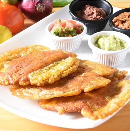 3 Patacones grandes, servidos con frijoles molidos, proteína a elegir y pico de gallo.