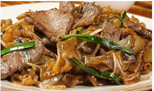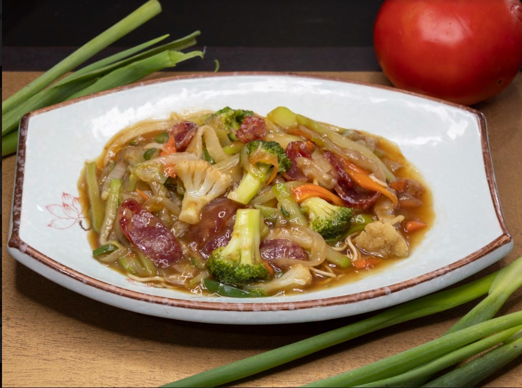 Con pollo, camarón, jamón, lechón, chorizo chino y verduras en salsa.