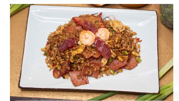 Con jamón, lechón, pollo, camarón, chorizo chino y verduras en salsa china.