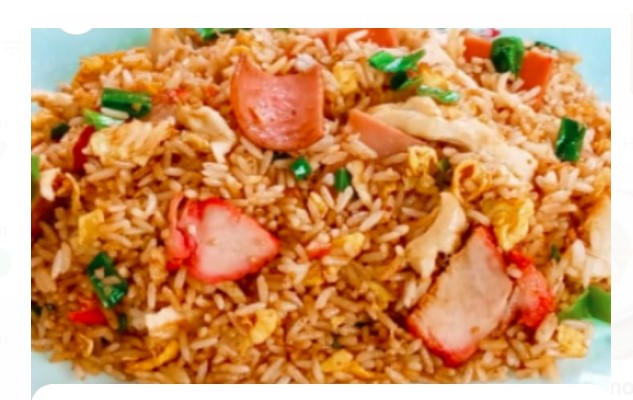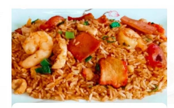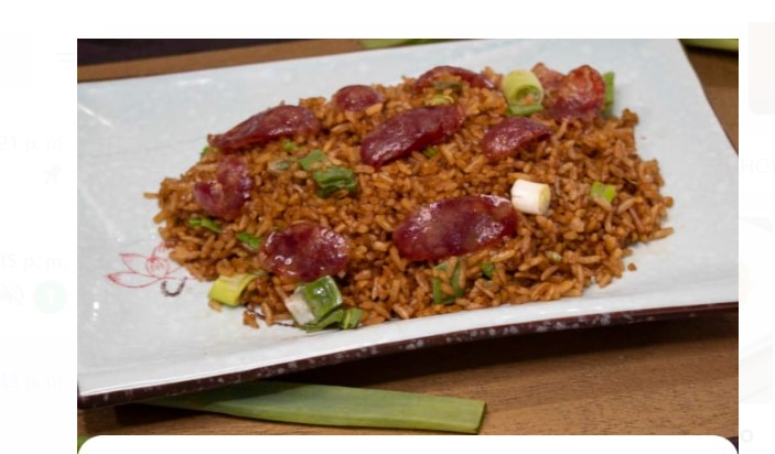 arroz, chorizos , maíz tierno , apio , cebolla larga picada , raíces chinas, salsa soya