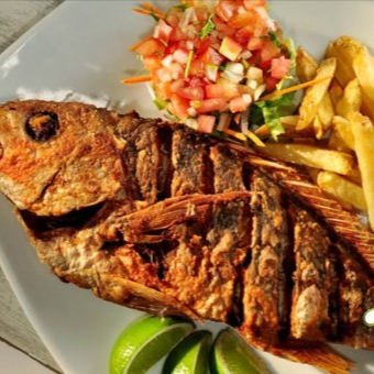 Delicioso pescado entero (Pargo) acompañado de papas fritas.