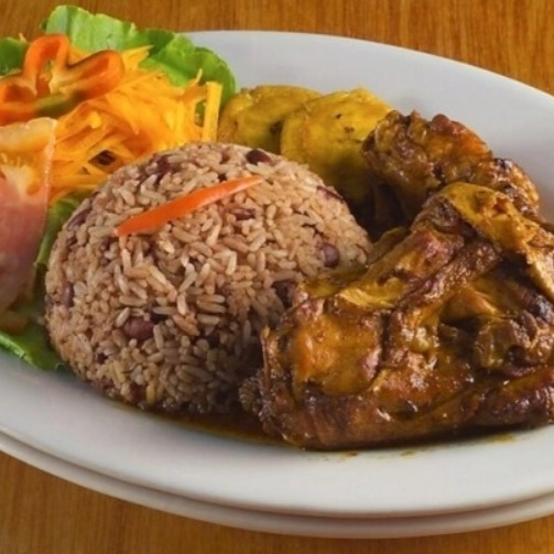 Delicioso rice and beans con 2 piezas de pollo en salsa caribeña, patacones, ensalada fría