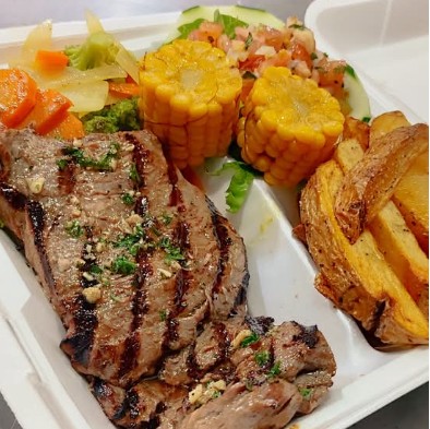 Lomito 100%, 280 g a la parrilla con chimichurri argentino, papas en gajo, vegetales, elote y ensalada.