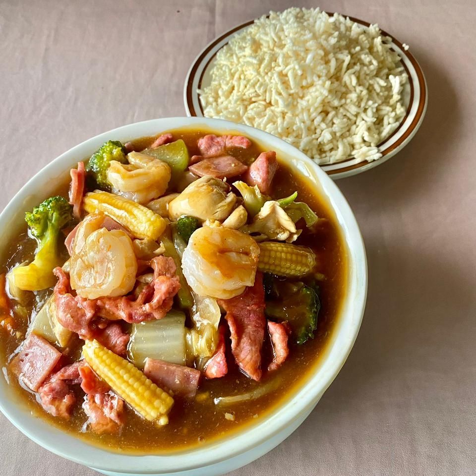 Pollo jamón lechón carne de res camarón y chorizo chino con verduras en salsa ostión