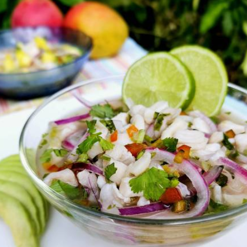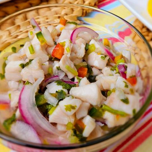 Ceviche preparado con pescado fresco, marinado en jugo de limón, sazonado en hierbas y especias.