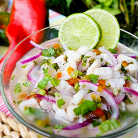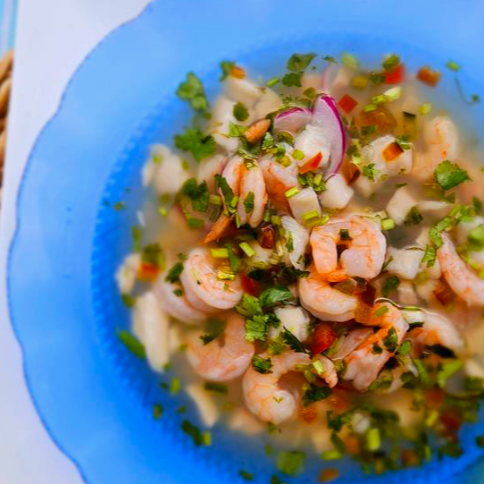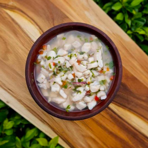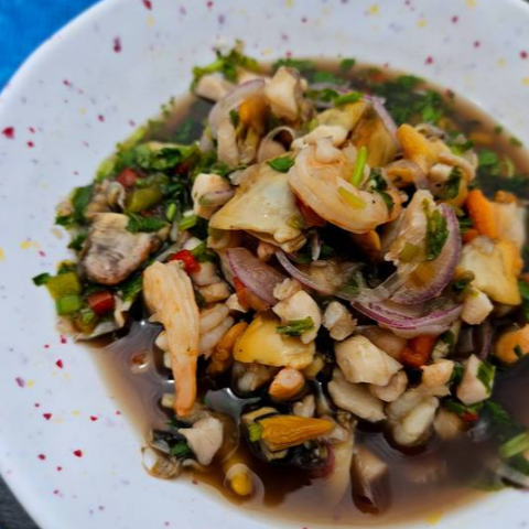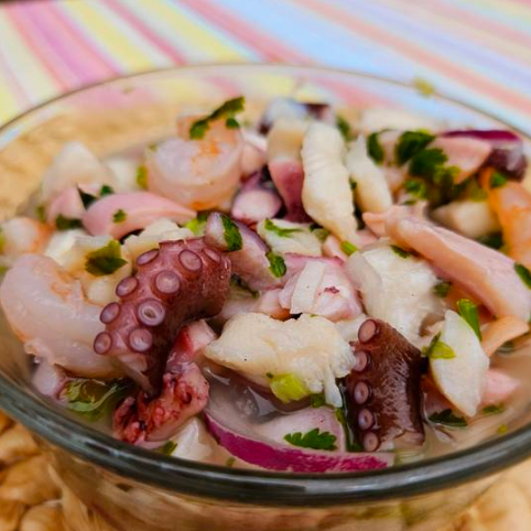 Ceviche en el que combinamos pescado fresco, calamar, pulpo, camarón y surimi, marinado en jugo de limón, sazonado con hierbas y especias.