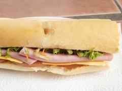 Baguette, tomate, jamón y queso amarillo, mantequilla y salsa de la casa.