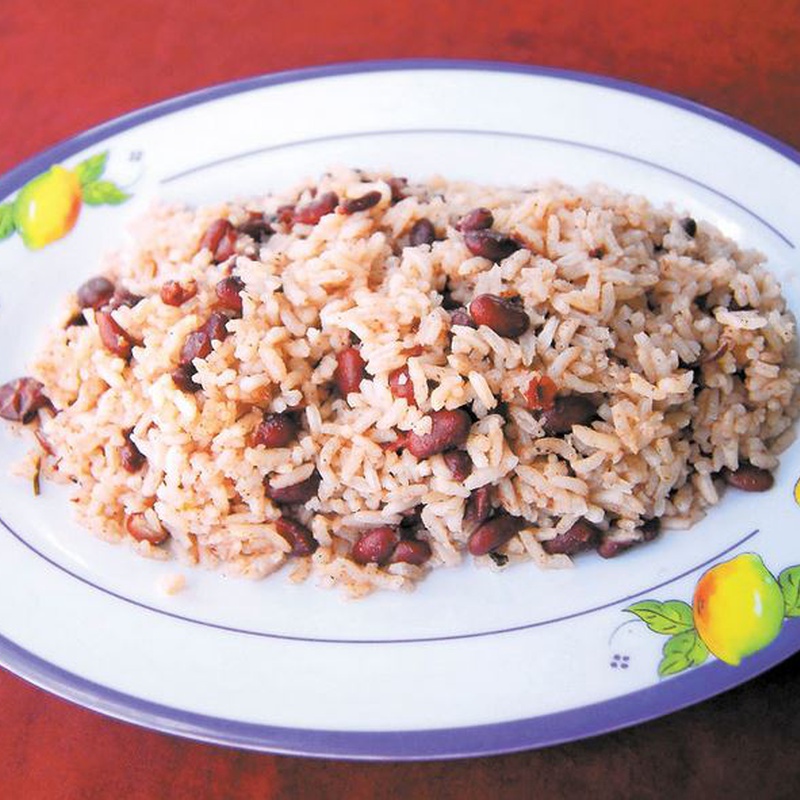 Arroz, frijoles,ensalada plátanos maduros, guarnición, proteína y fresco natural.