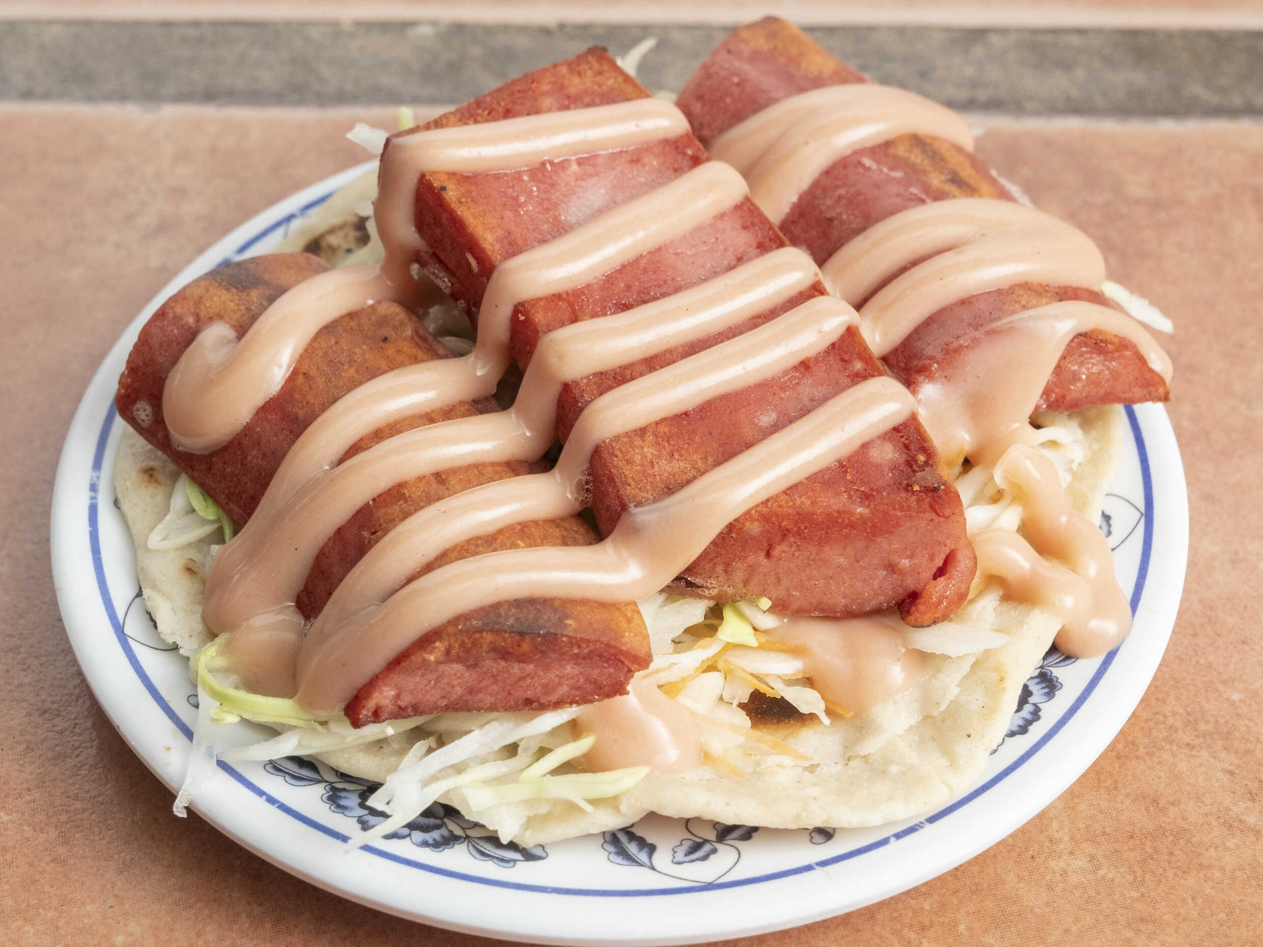Sándwich de salchichón con o sin chile, tomate, mantequilla, salsa y tomate en rodajas.