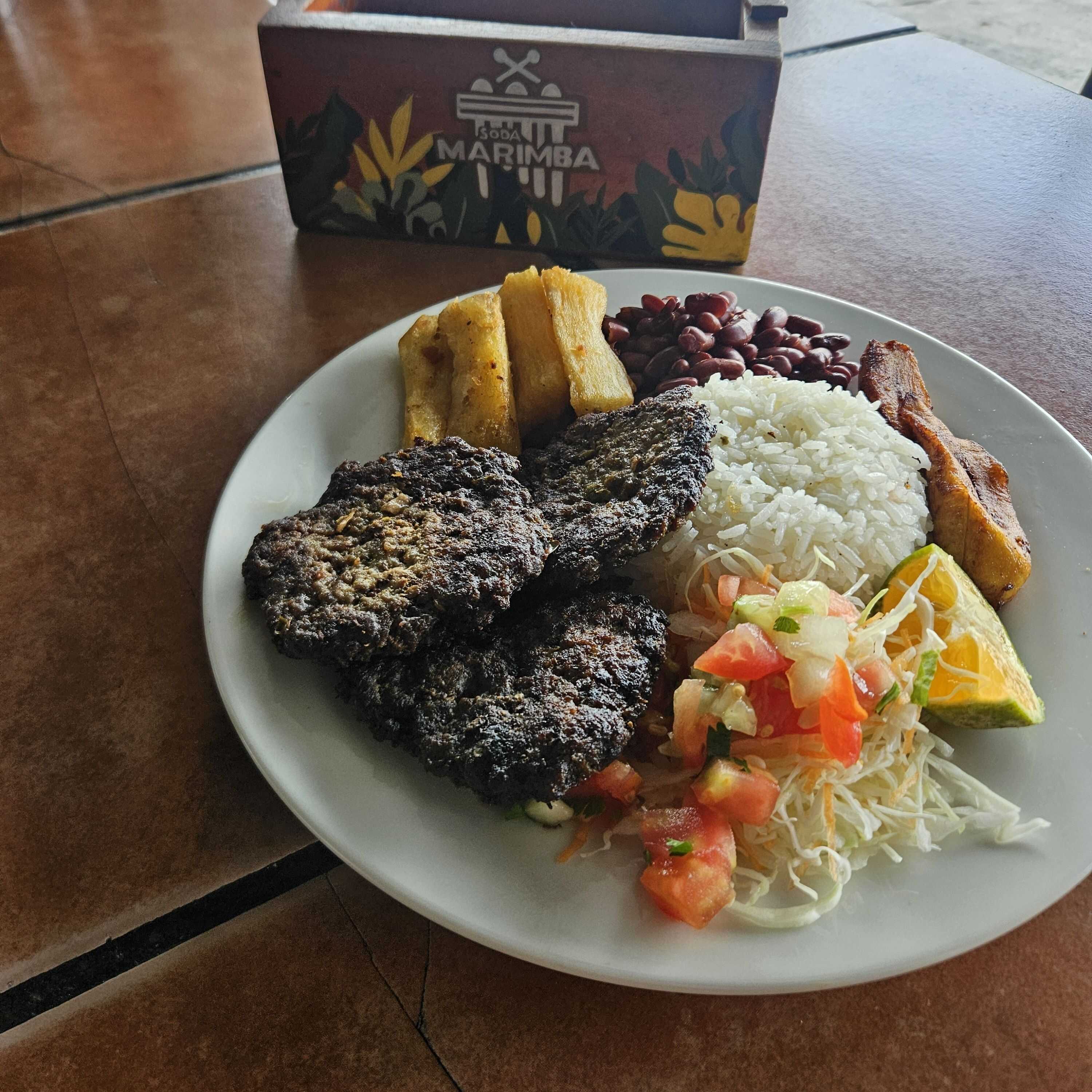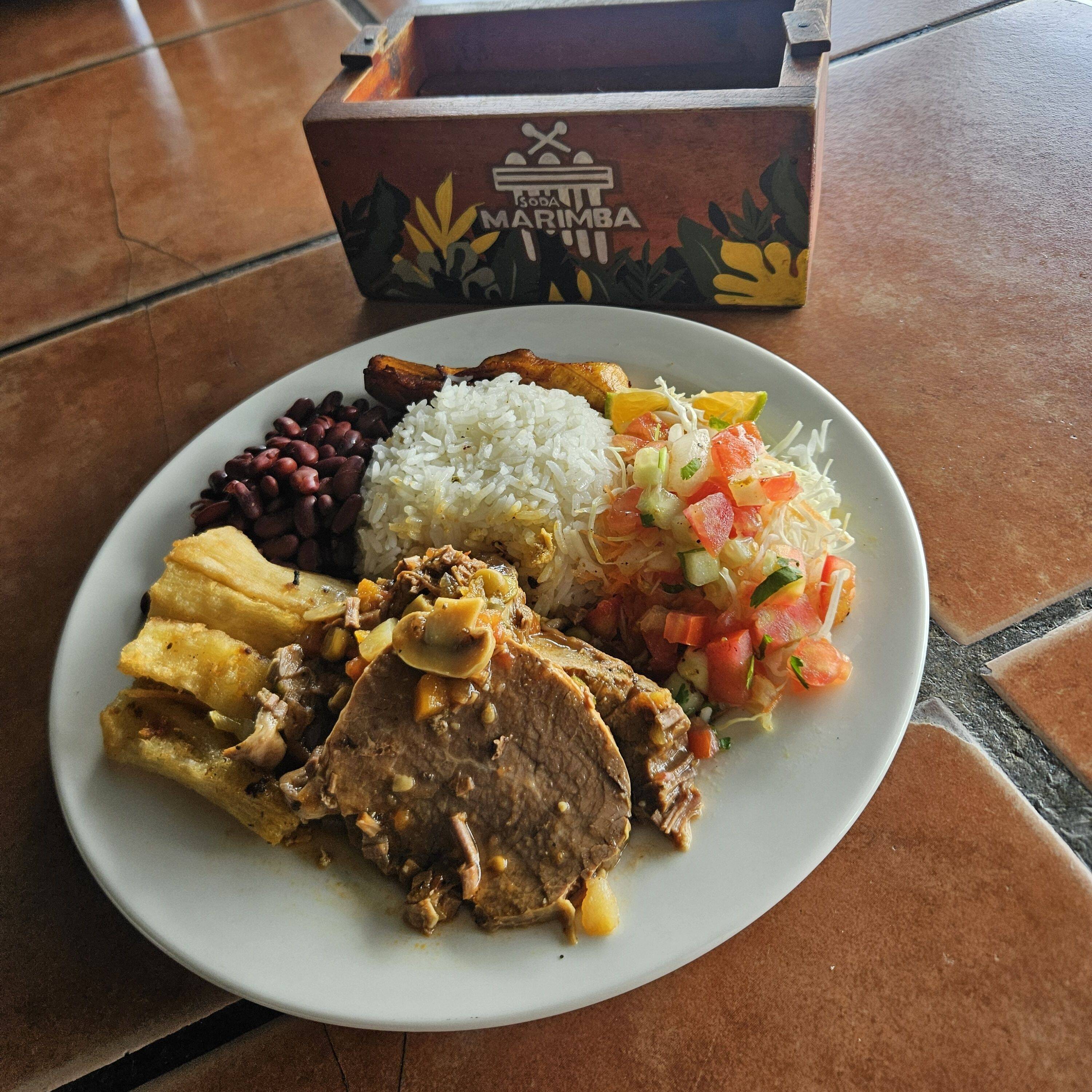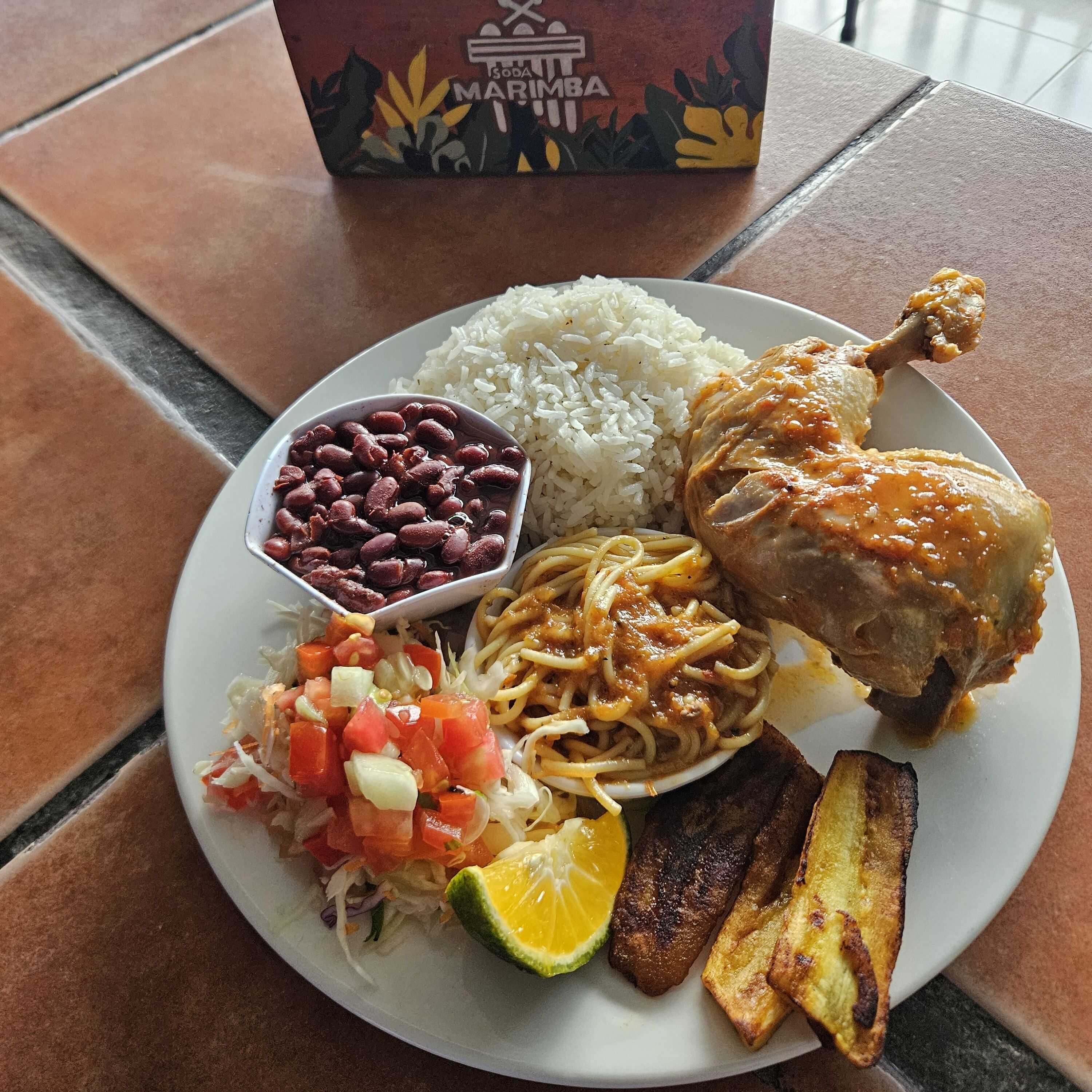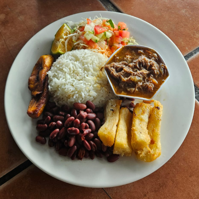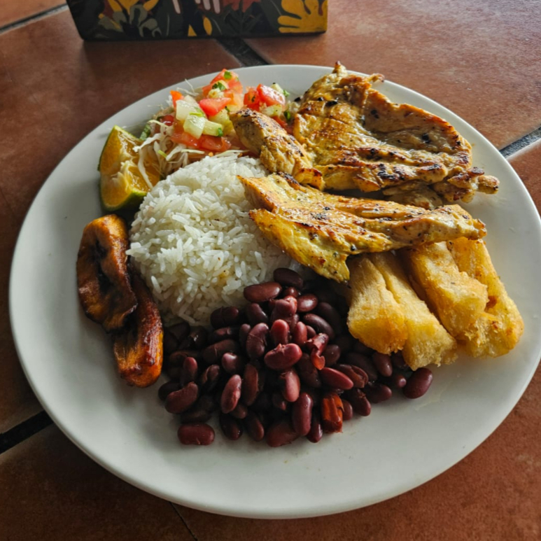 Arroz, frijoles, ensalada, plátanos maduros, yuca frita o picadillo, pollo al plancha y el fresco natural.