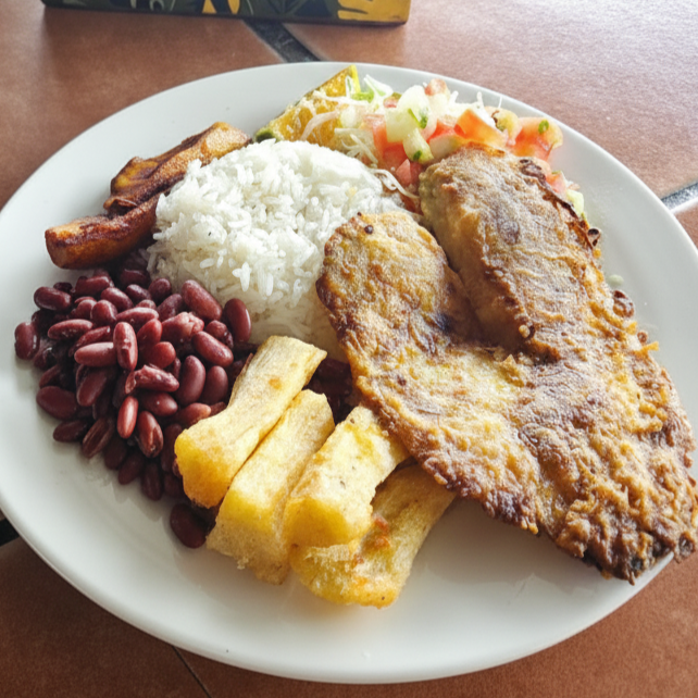 Arroz, frijoles, ensalada, plátanos maduros, yuca frita o picadillo, pescado y fresco natural. pescado