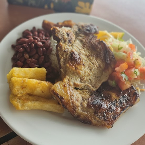 Arroz,Frijoles, Platanos maduros,yuca frita, ensalada, Chuleta y fresco natural.