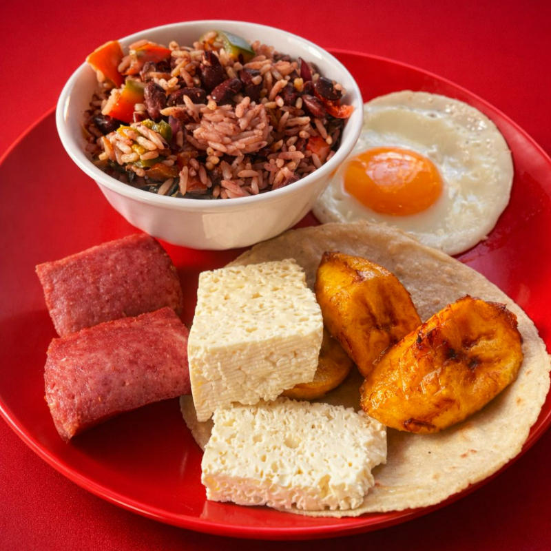Un plato bien cargado para empezar el día con todo el sabor: delicioso gallo pinto recién hecho, acompañado de huevo frito con yema suave, plátano maduro doradito, queso fresco, salchichón y tortilla calientita.