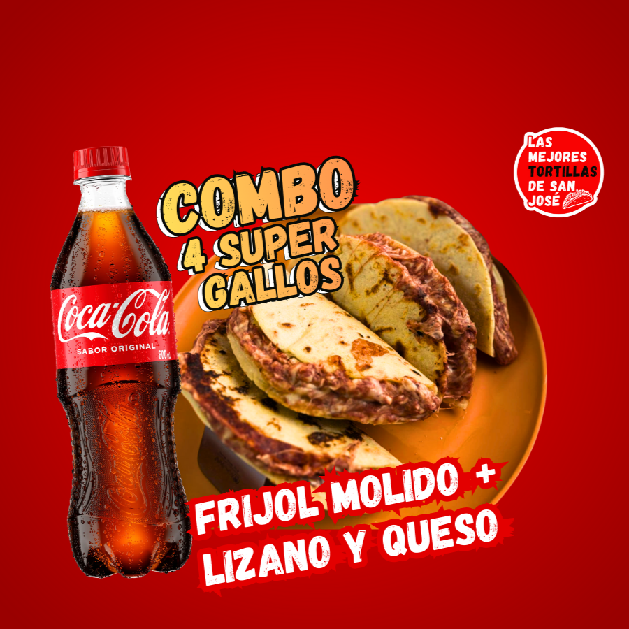 Un combo perfecto para matar el antojo. Cuatro súper gallos en tortilla palmeada grande, bien rellenos, fresquitos y llenos de sabor llevan frijol molido rojo bien cocinado en salsa lizano, queso madurado que se derrite, acompañados de una Coca-Cola para disfrutarlo aún más. Ideal para compartir… o para quedártelo todo. ¡Satisfacción garantizada!