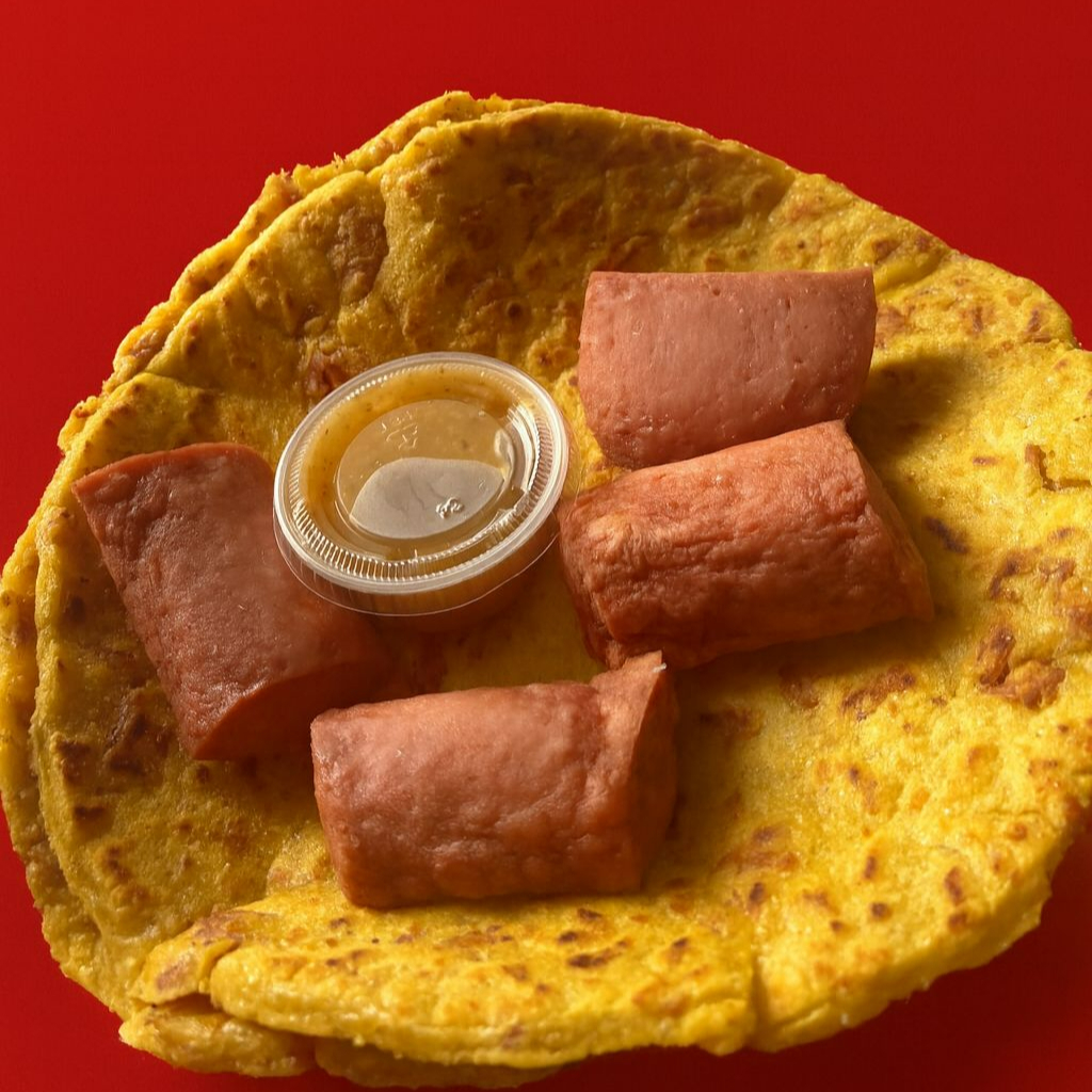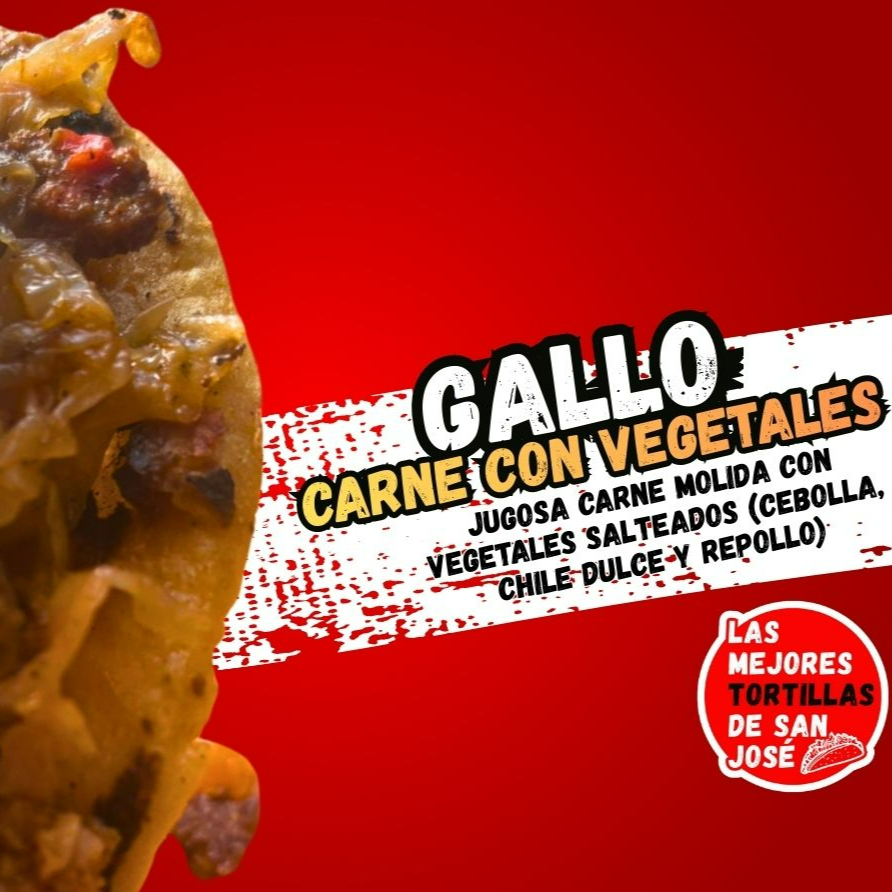 Un gallo cargado de sabor casero: suave tortilla palmeada rellena de carne molida jugosa, mezclada con vegetales salteados (cebolla, chile dulce y repollo) para un toque fresco y crujiente. Un clásico tico perfecto para cualquier antojo.