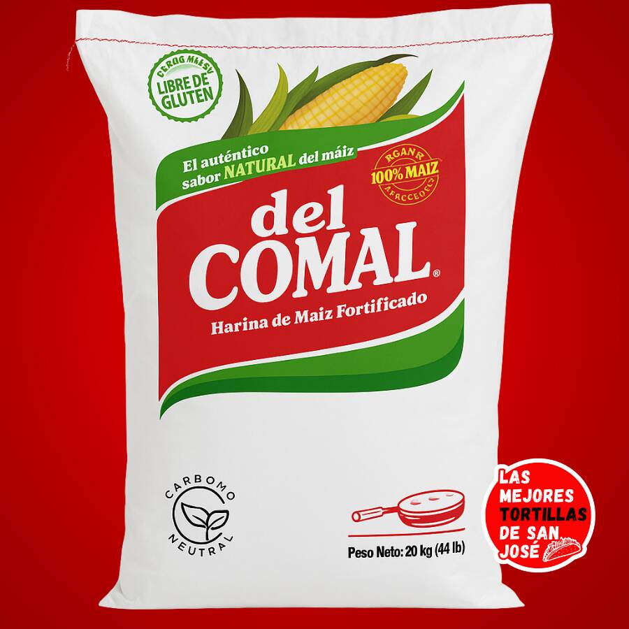Harina de maíz Del Comal en saco 20kg, perfecta para preparar tortillas, empanadas, chorreadas y todo tipo de platillos tradicionales. De textura fina, fresca y con el sabor auténtico del maíz tico. Ideal para uso diario o para quienes aman cocinar al estilo casero.